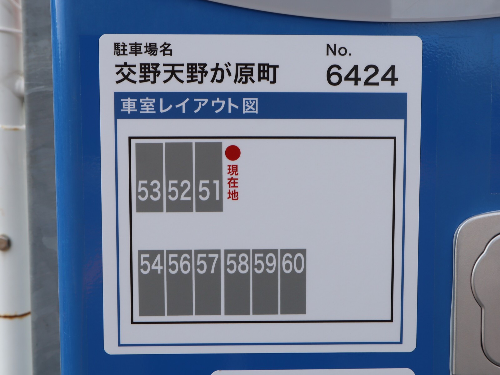 サンウォッシュの前を通り過ぎたところに青い精算機があって、その精算機には車室レイアウト図と書かれたマップが貼ってあり、駐車場として利用できる位置を把握することができます。