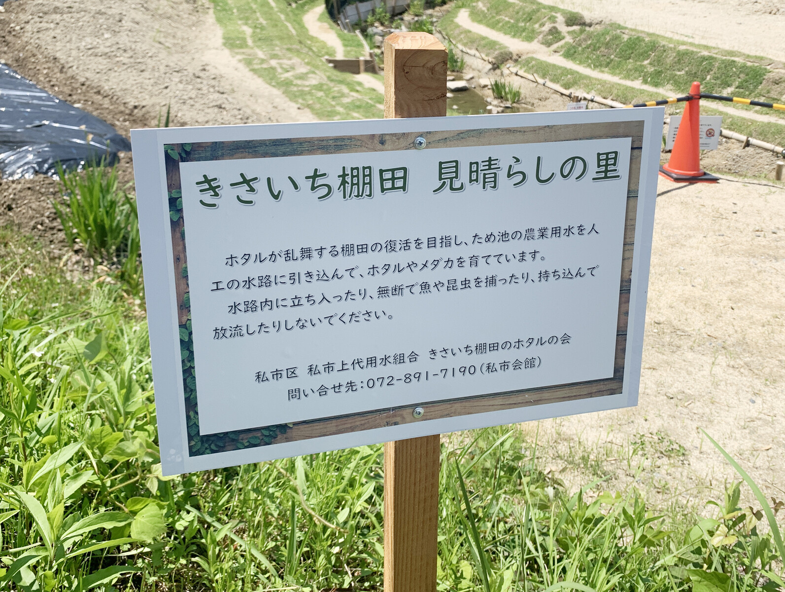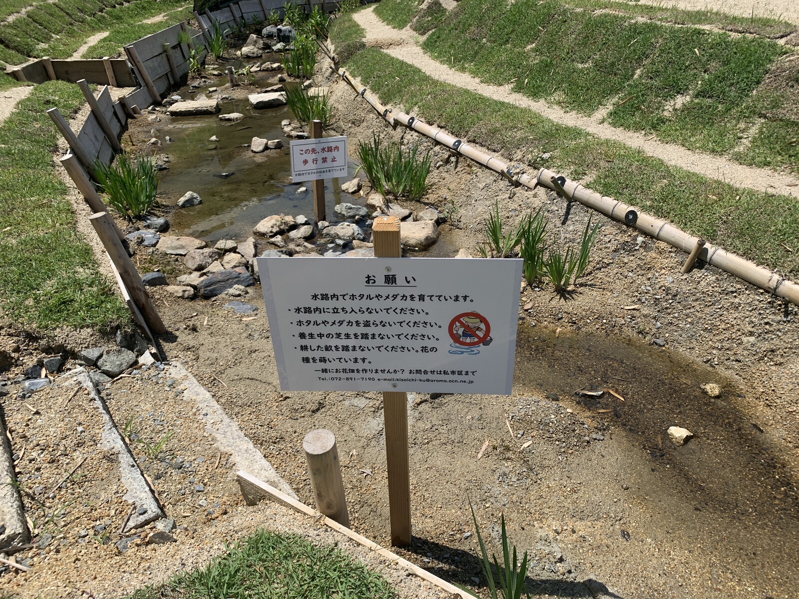 看板にも記載されていますが、現在、整備し、ホタルやメダカを育てている途中ですので、くれぐれも中に入って遊ばないようにご注意ください。