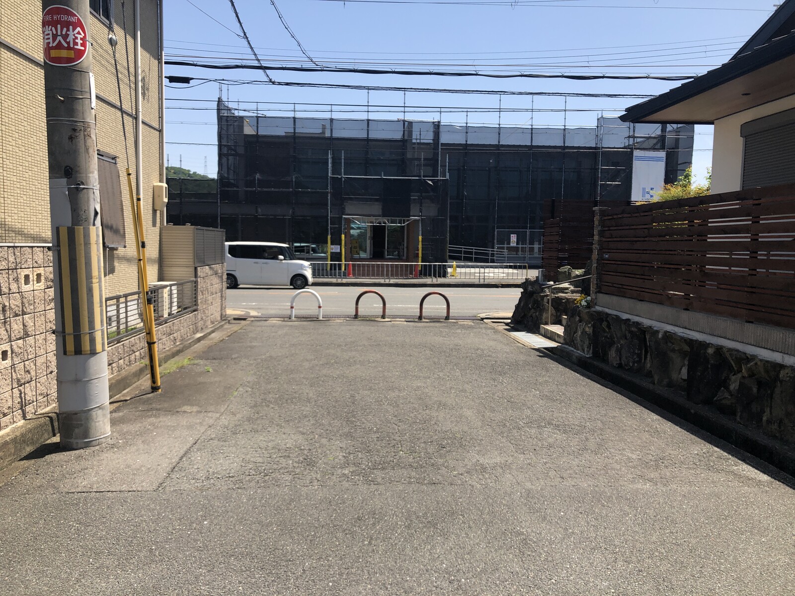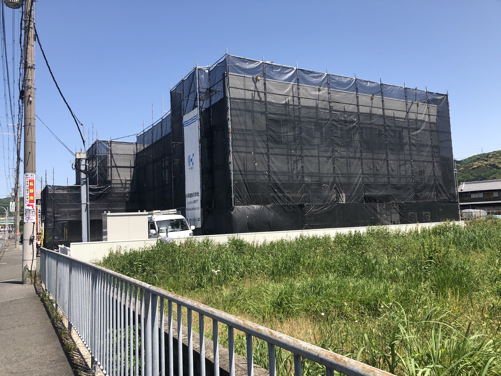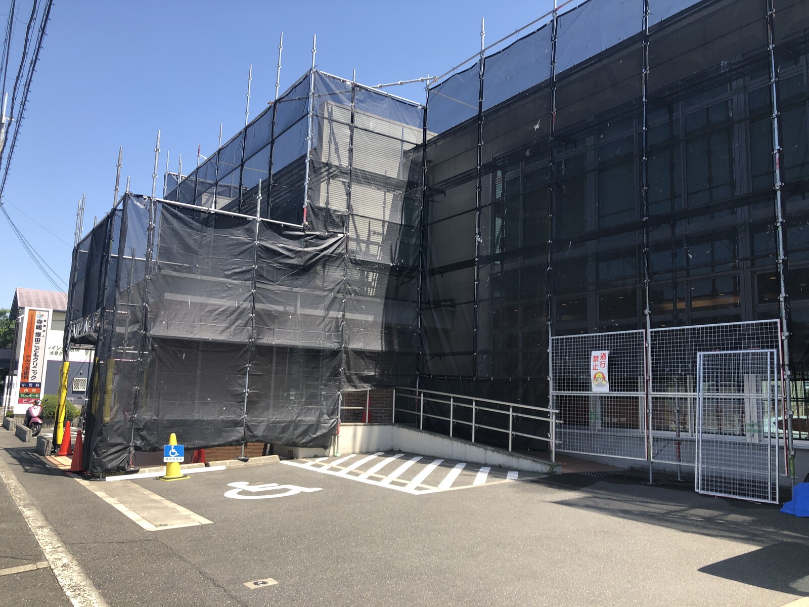寺嶋塚田こどもクリニックの建物外観はこんな感じですっかり足場も出来上がっていて、工事用のネットで覆われた姿は、なかなか重厚感がありました。