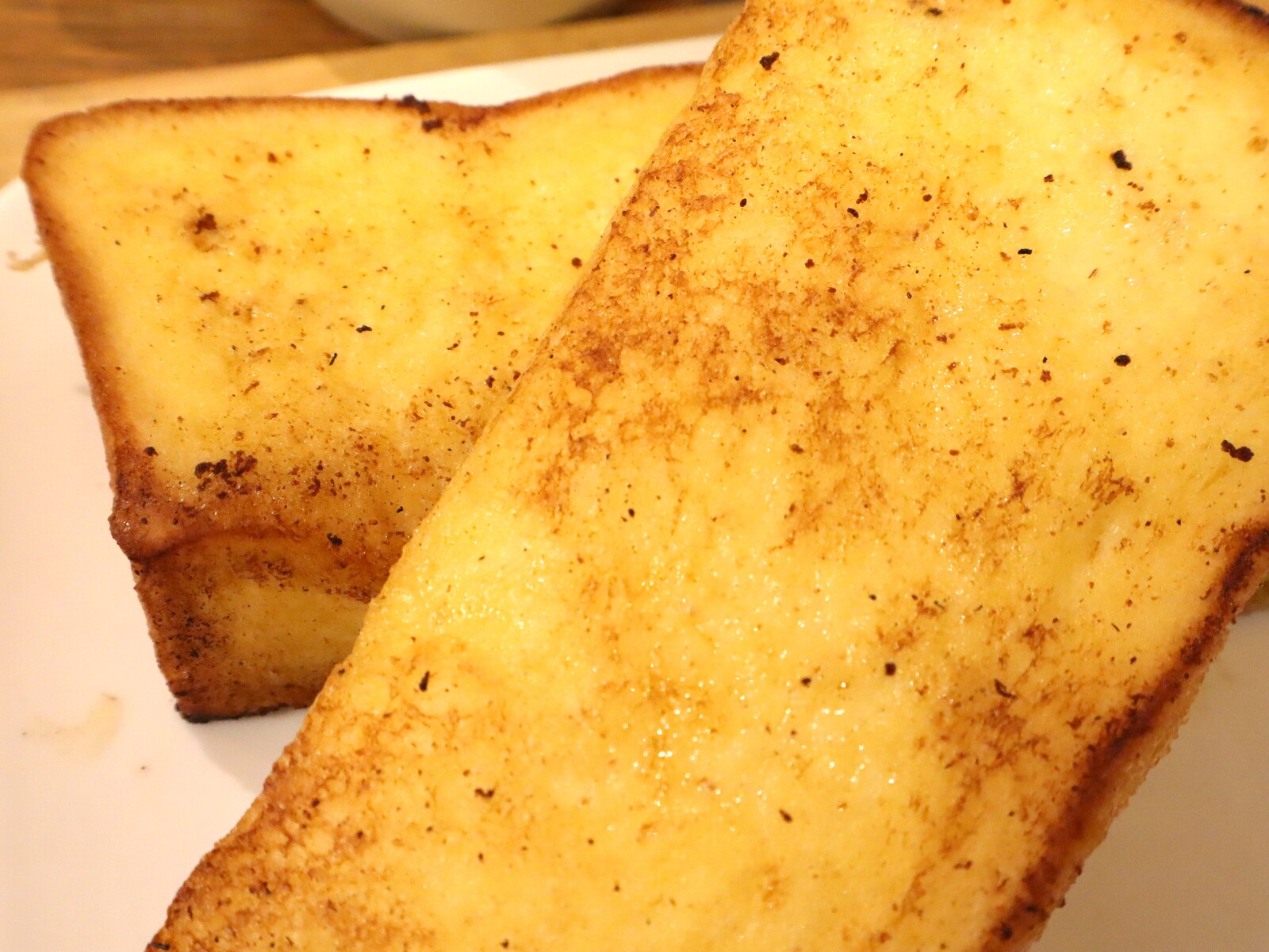 フレンチトーストは分厚い食パン1枚分を使用しており、ほどよい甘さとジューシーな食感がたまらない!