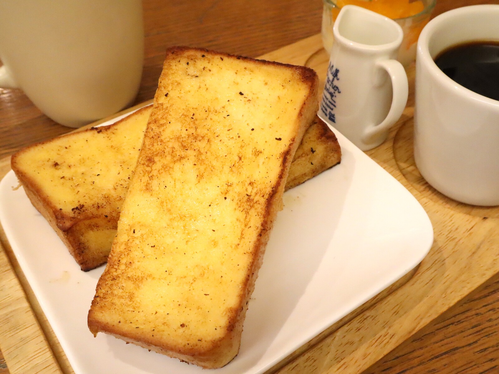 セット内容はフレンチトースト、ミニデザート、お好きなドリンクで、今回はホットコーヒーをチョイスしたので小さなミルクピッチャーがプレートにのっています。