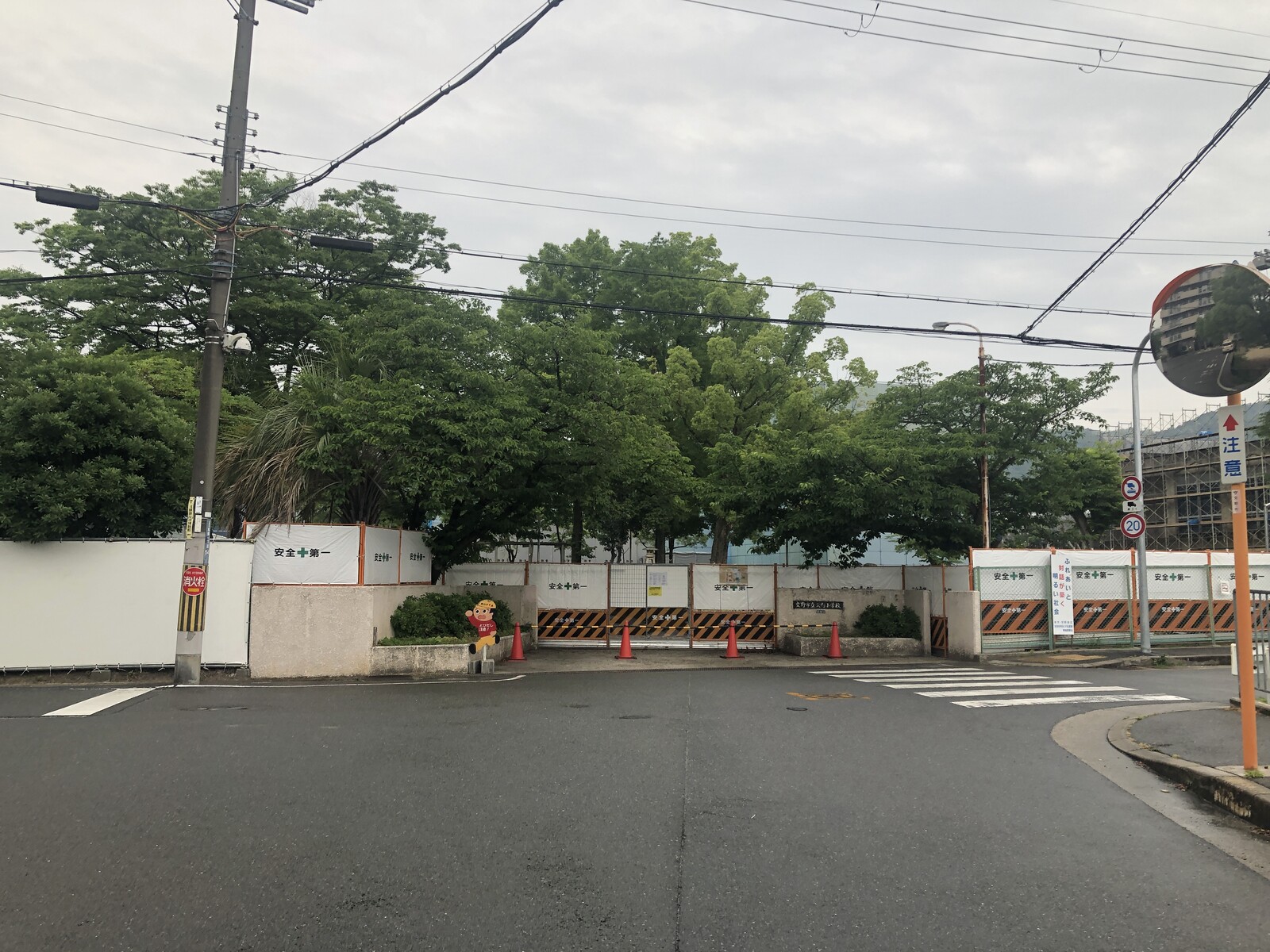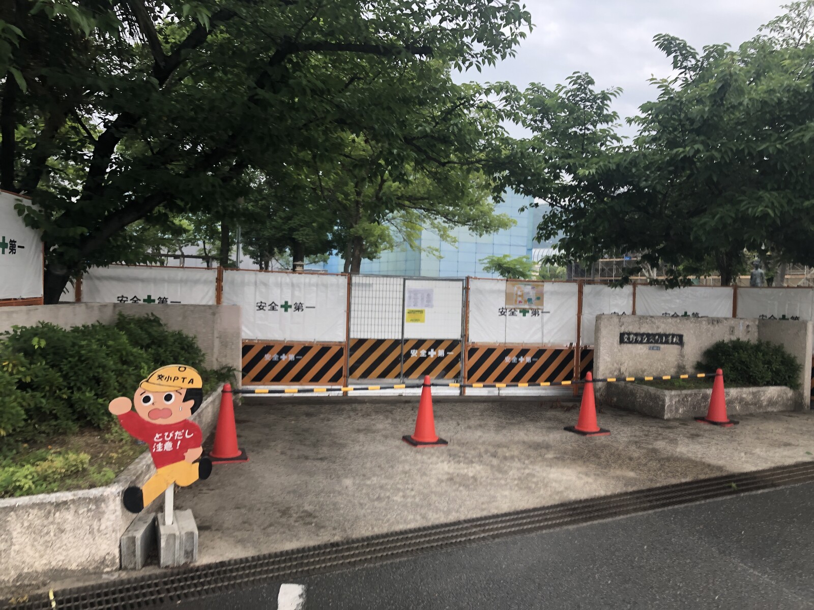 交野小学校の解体工事がいよいよ始まってる!〜敷地を取り囲む白いフェンス、体育館や校舎はフワッと覆われていたり〜