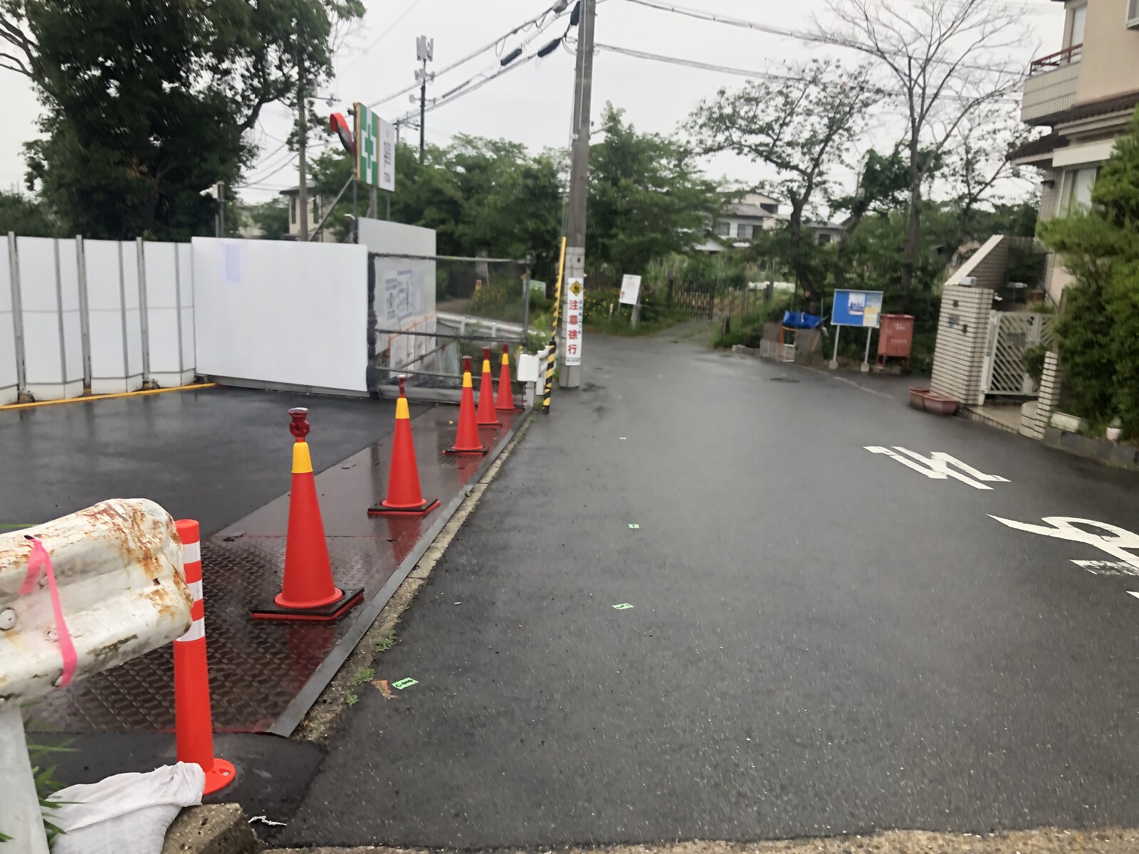 交野小学校の正門のところからぐるっと白い工事用フェンスが登場しています。