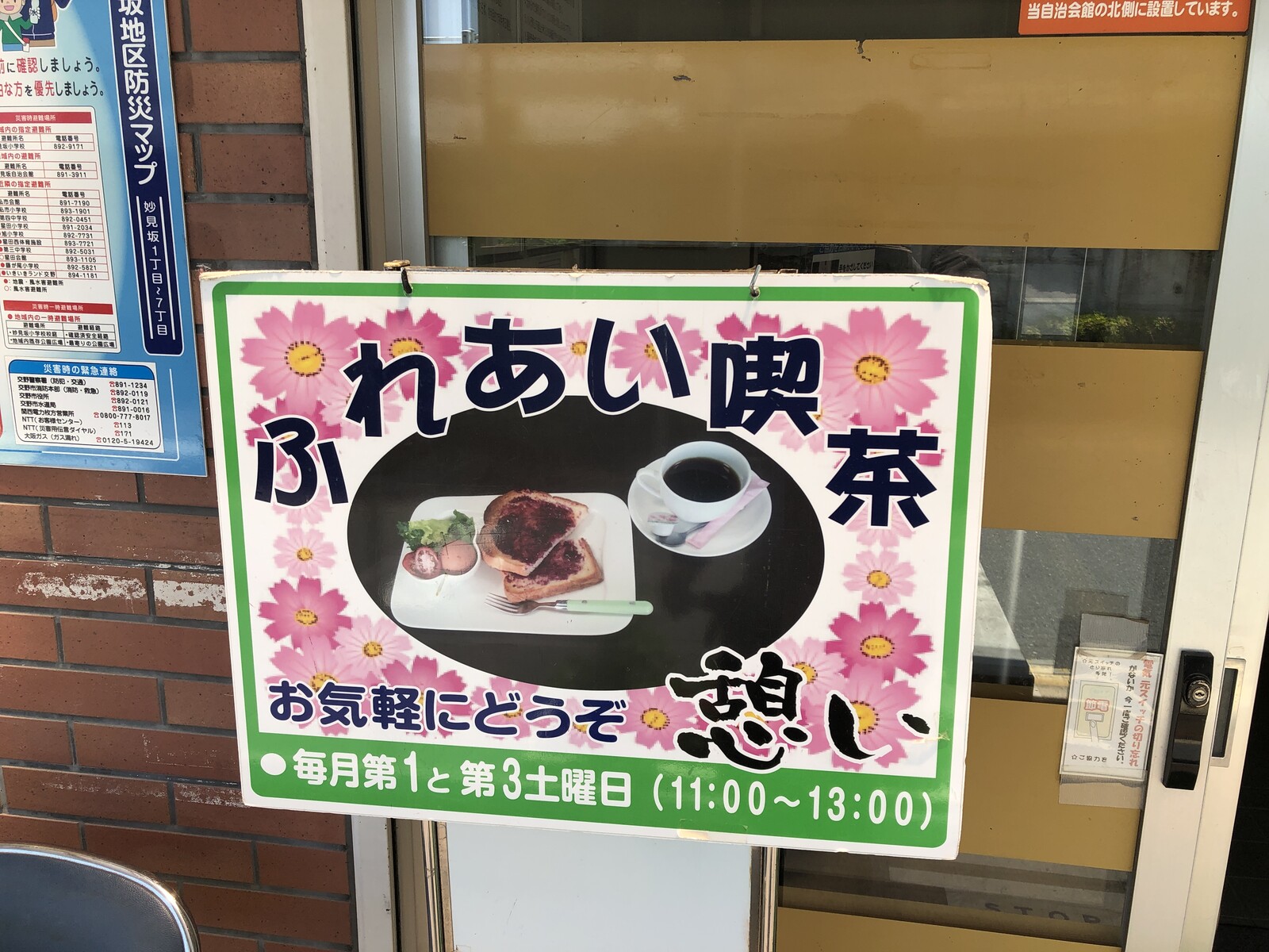 お気軽にどうぞ ふれあい喫茶憩いって書かれた看板があって、こちら妙見坂自治会館ふれあいで喫茶店が登場するということのようです。