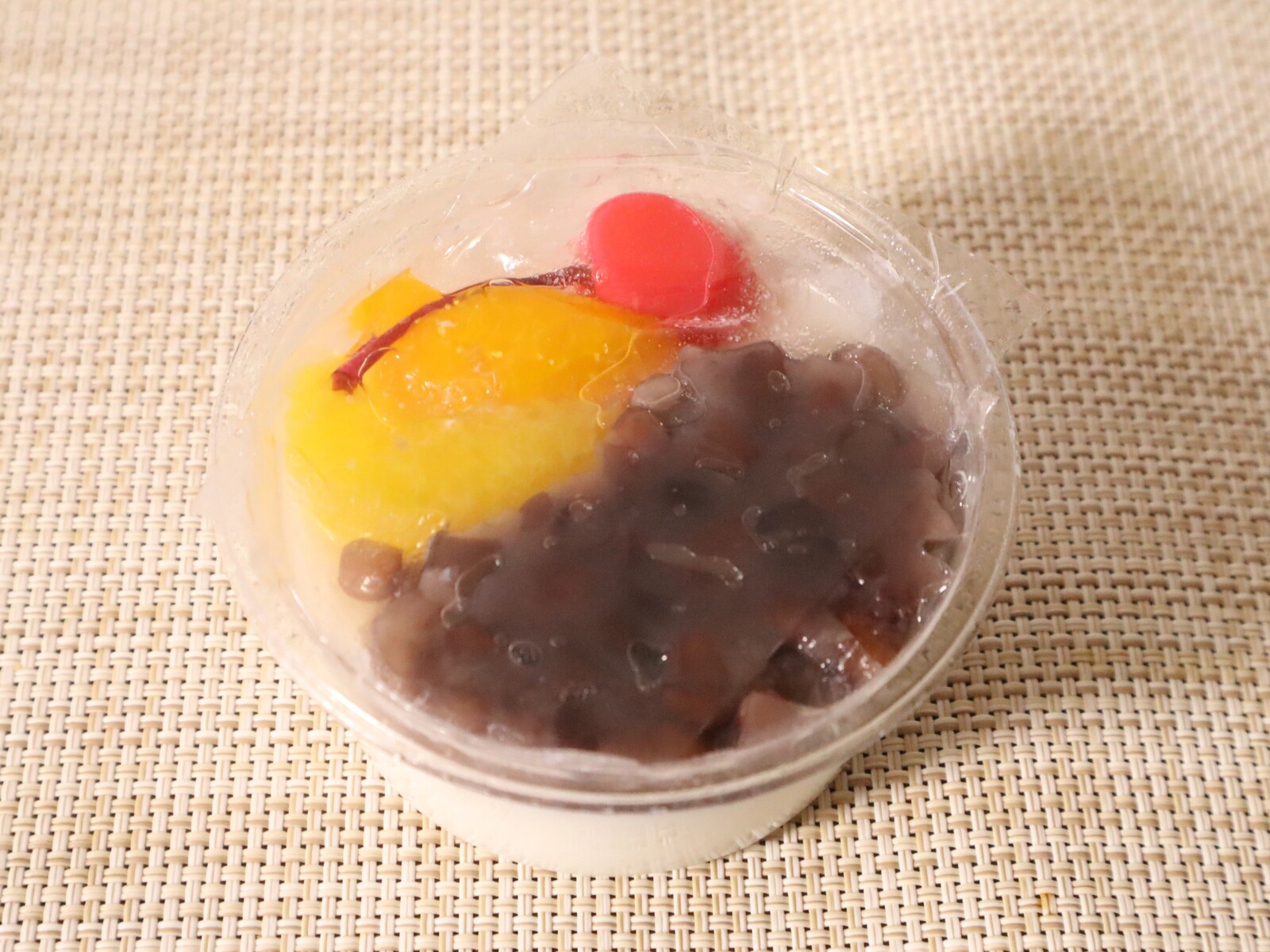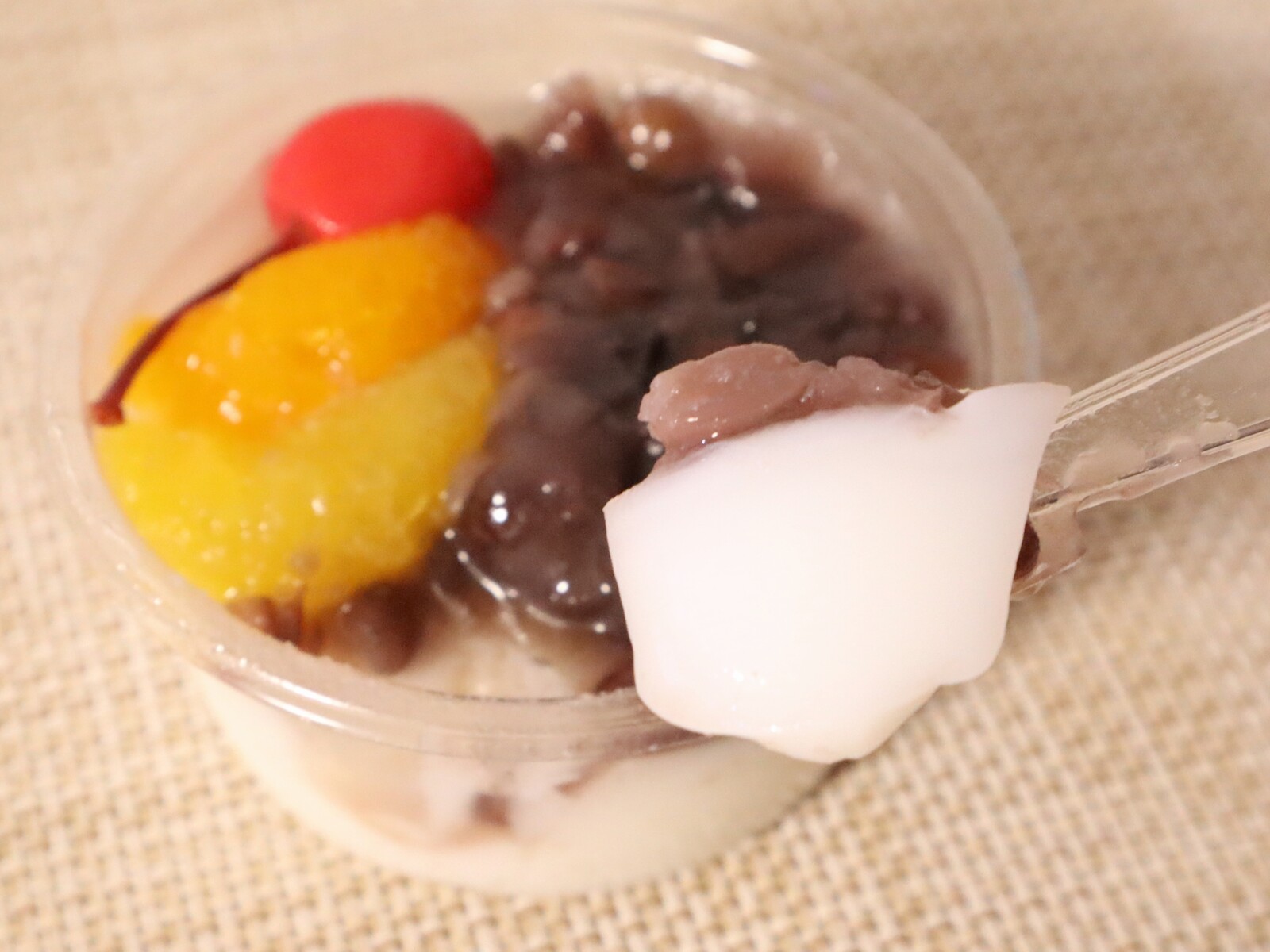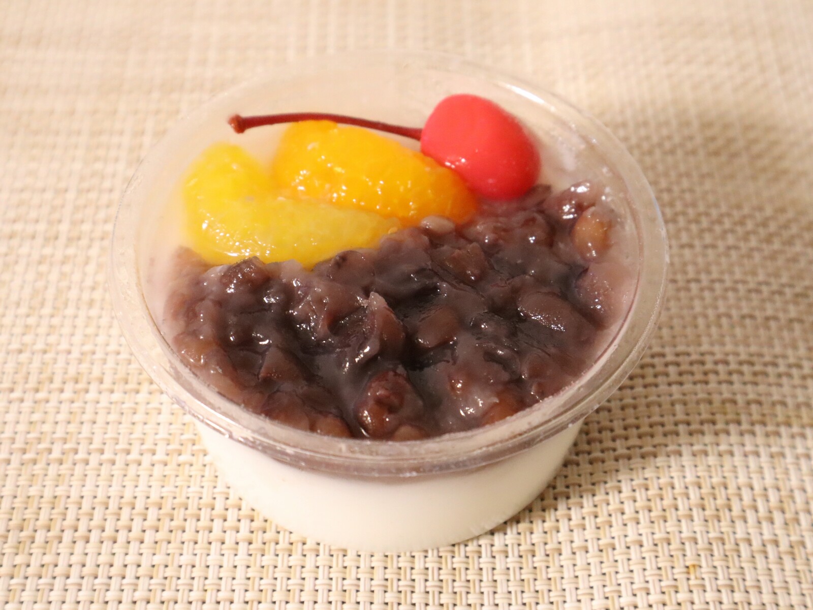 ぷるんっとした食感に甘すぎない粒あん、そしてフルーツも一緒に食べると、中華風あんみつのような味わいになるスイーツ。