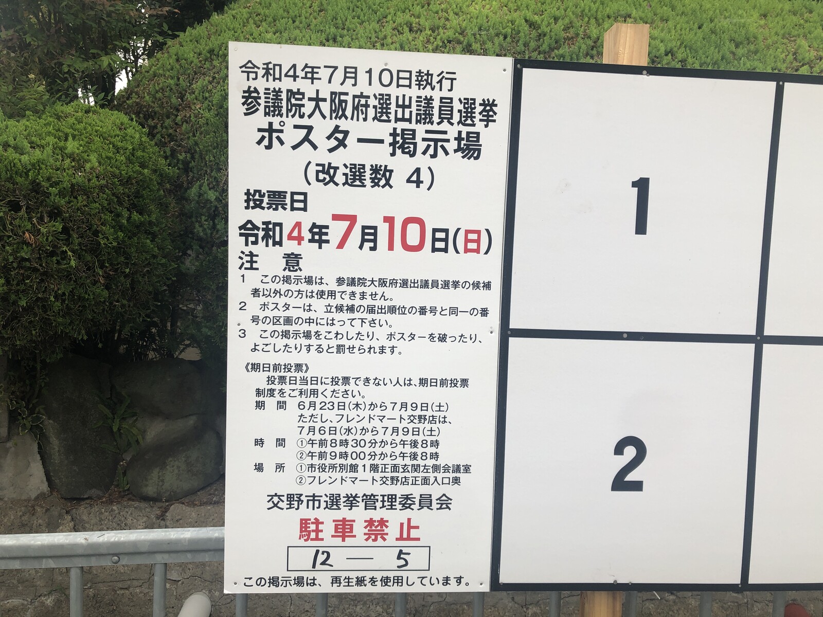 ズラーっと横長!参議院選挙のポスター掲示場が交野市内各地で登場してる!〜参議院選挙は7月10日(日)投票日〜
