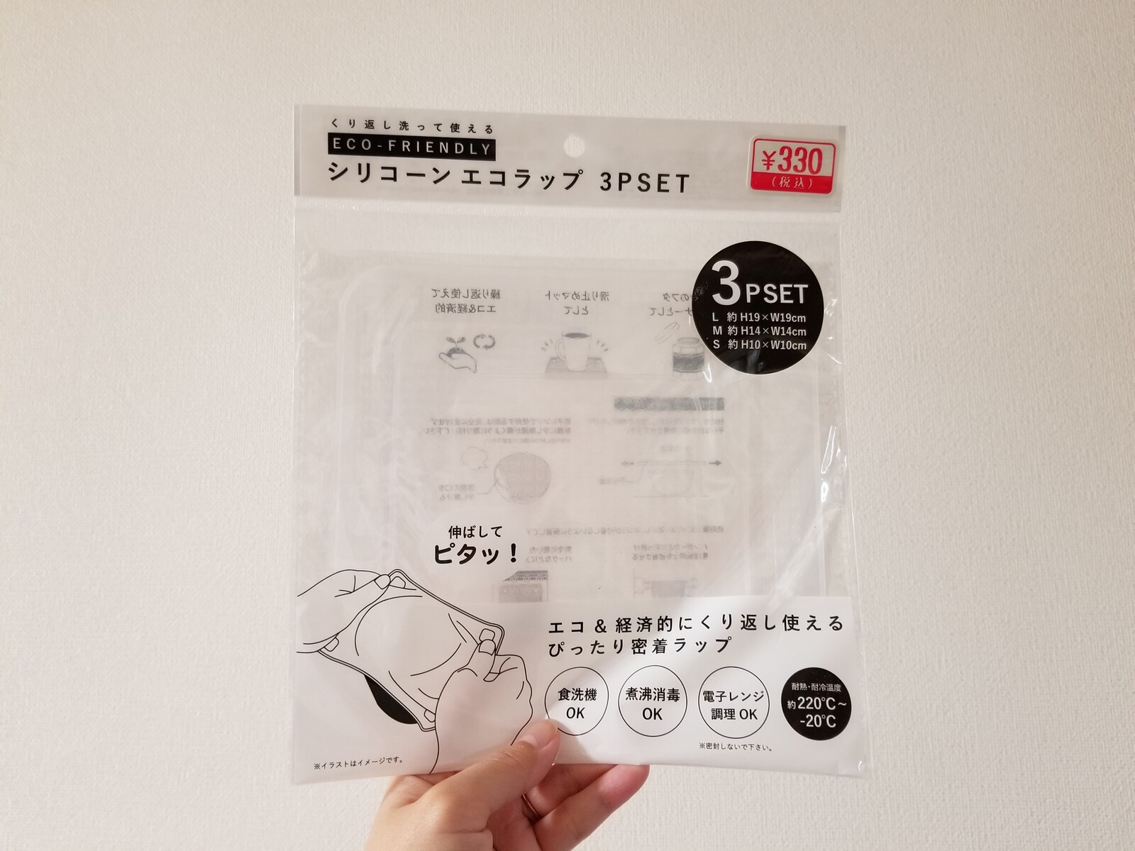 S・M・Lとサイズ違いのエコラップが3枚入って330円(税込)です。