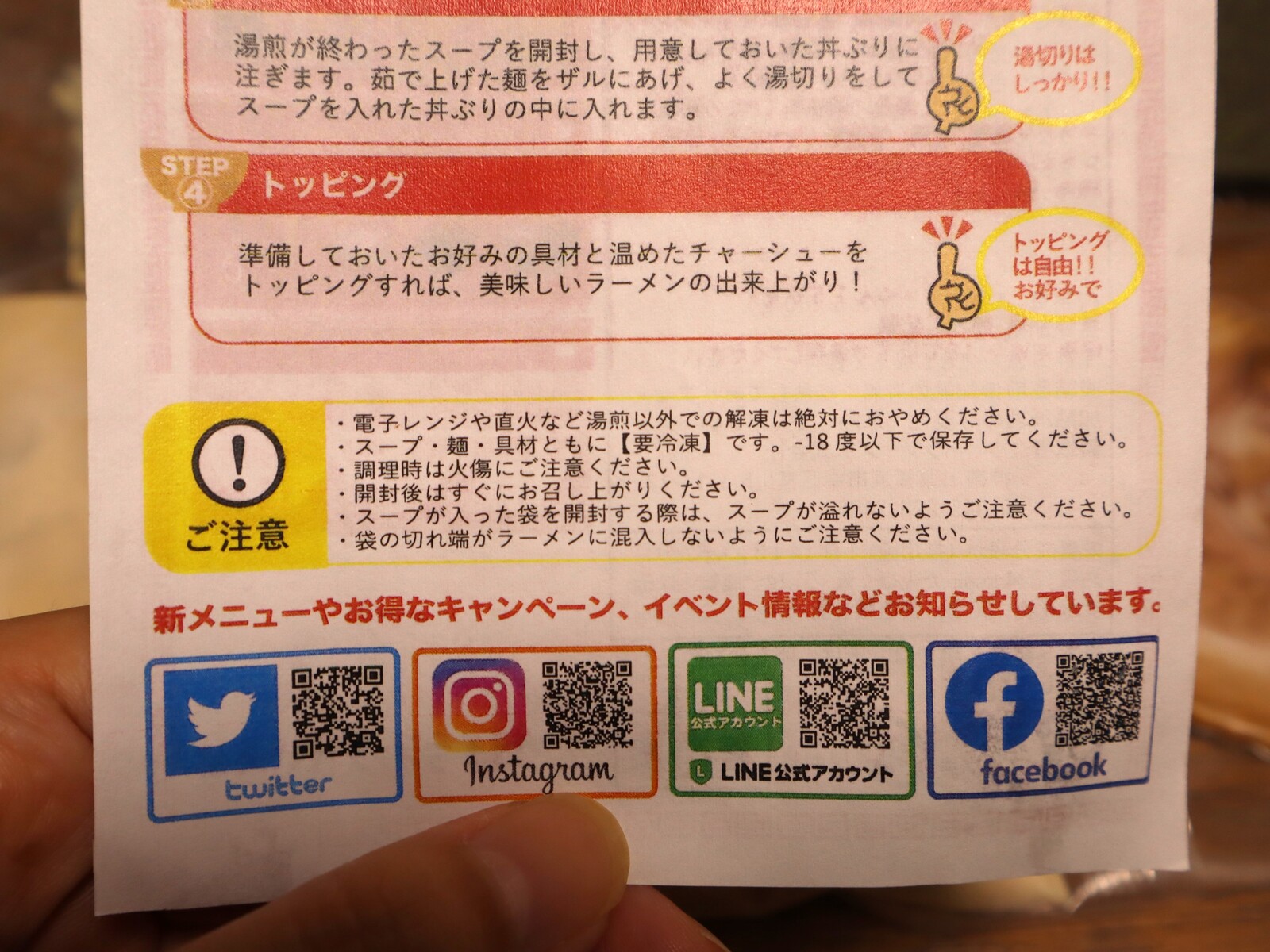 注意事項としましては、スープ・麺・具材ともに要冷凍だということ、スープなどを温める時は電子レンジや直火など湯煎以外の解凍は絶対におやめくださいということなどが書かれてあります。