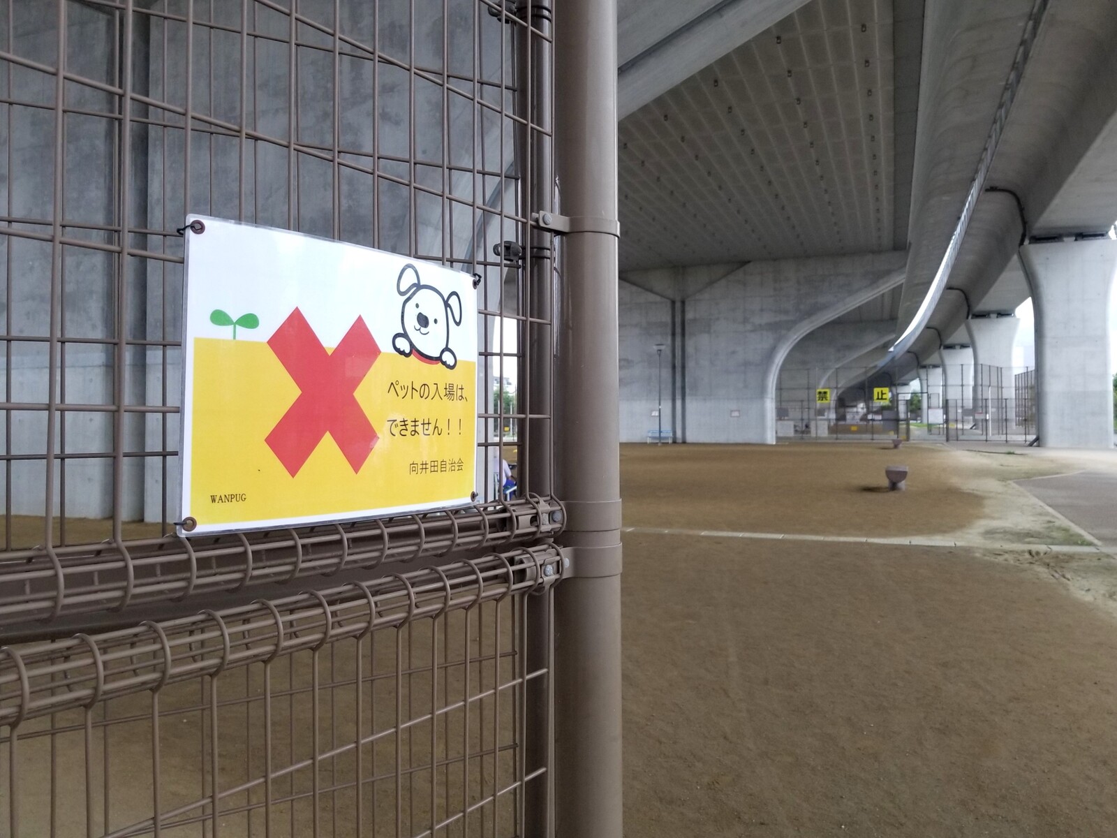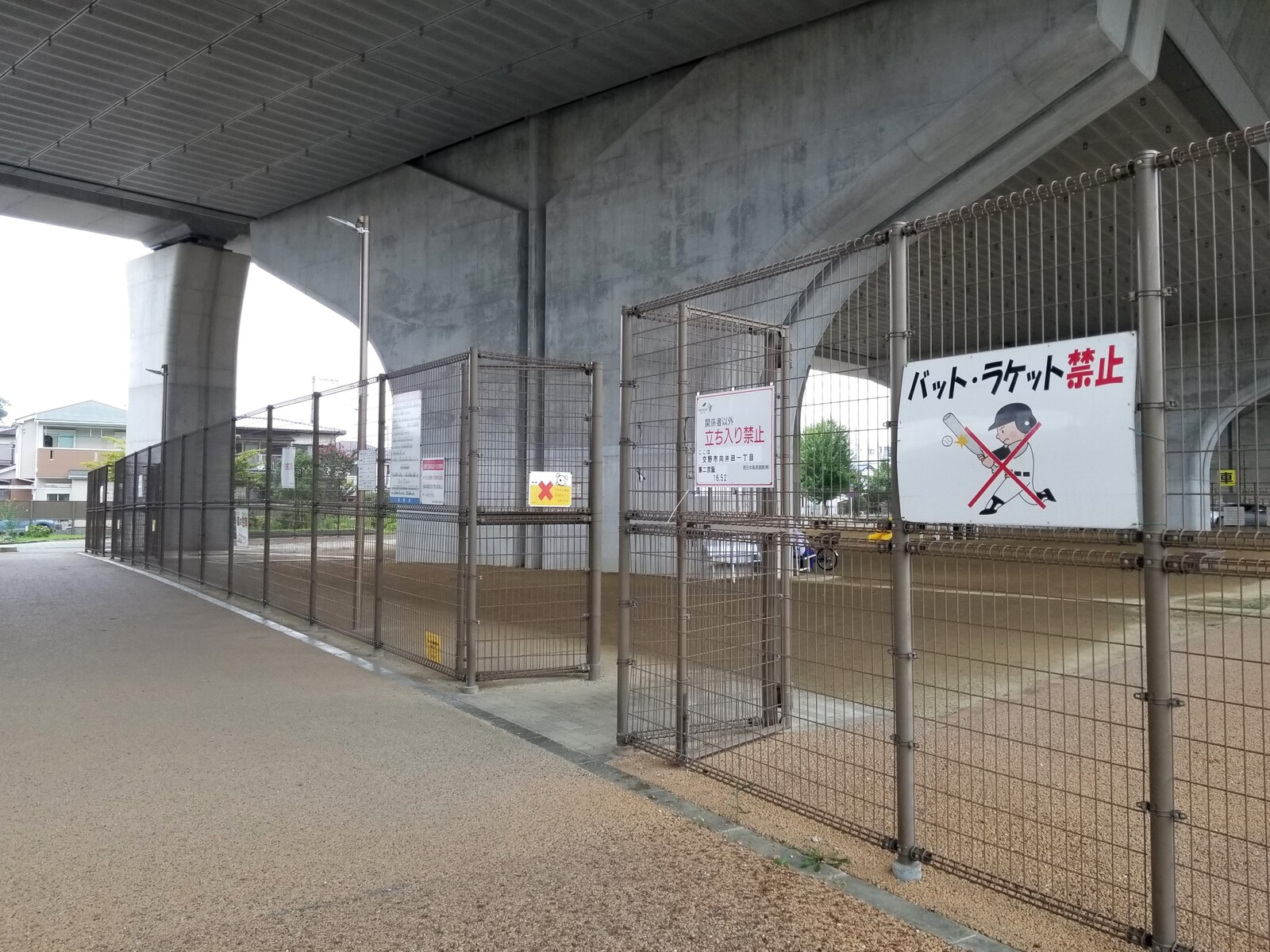 第二京阪道路のちょうど真下にあり、公園の周りは高さのあるフェンスで囲まれています。