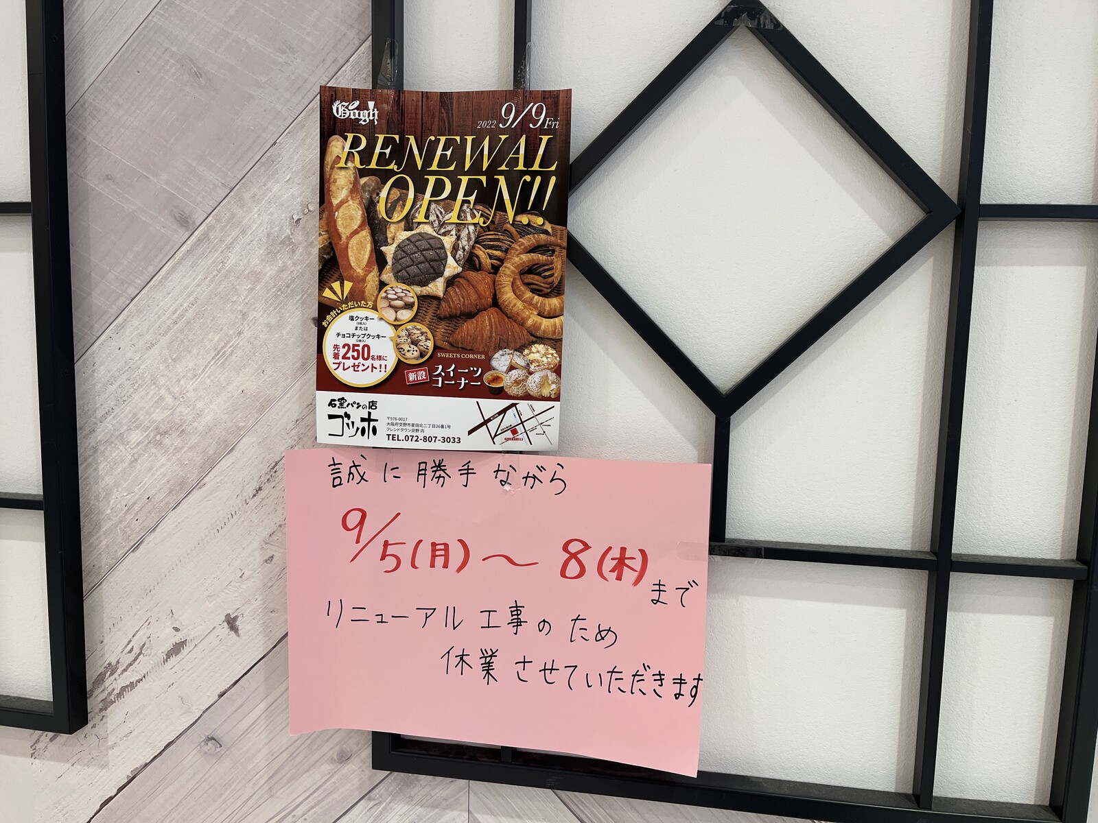 9月5日(月)〜8日(木)までリニューアル工事のため休業ということで、休業前からチラシとお知らせが店舗壁面に掲示されていました。