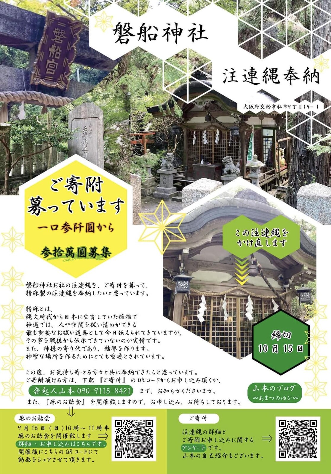 10月15日締め切りで磐船神社の注連縄奉納の寄附活動があって、その取り組みの一環として麻のお話会というのが開催されるそうです。