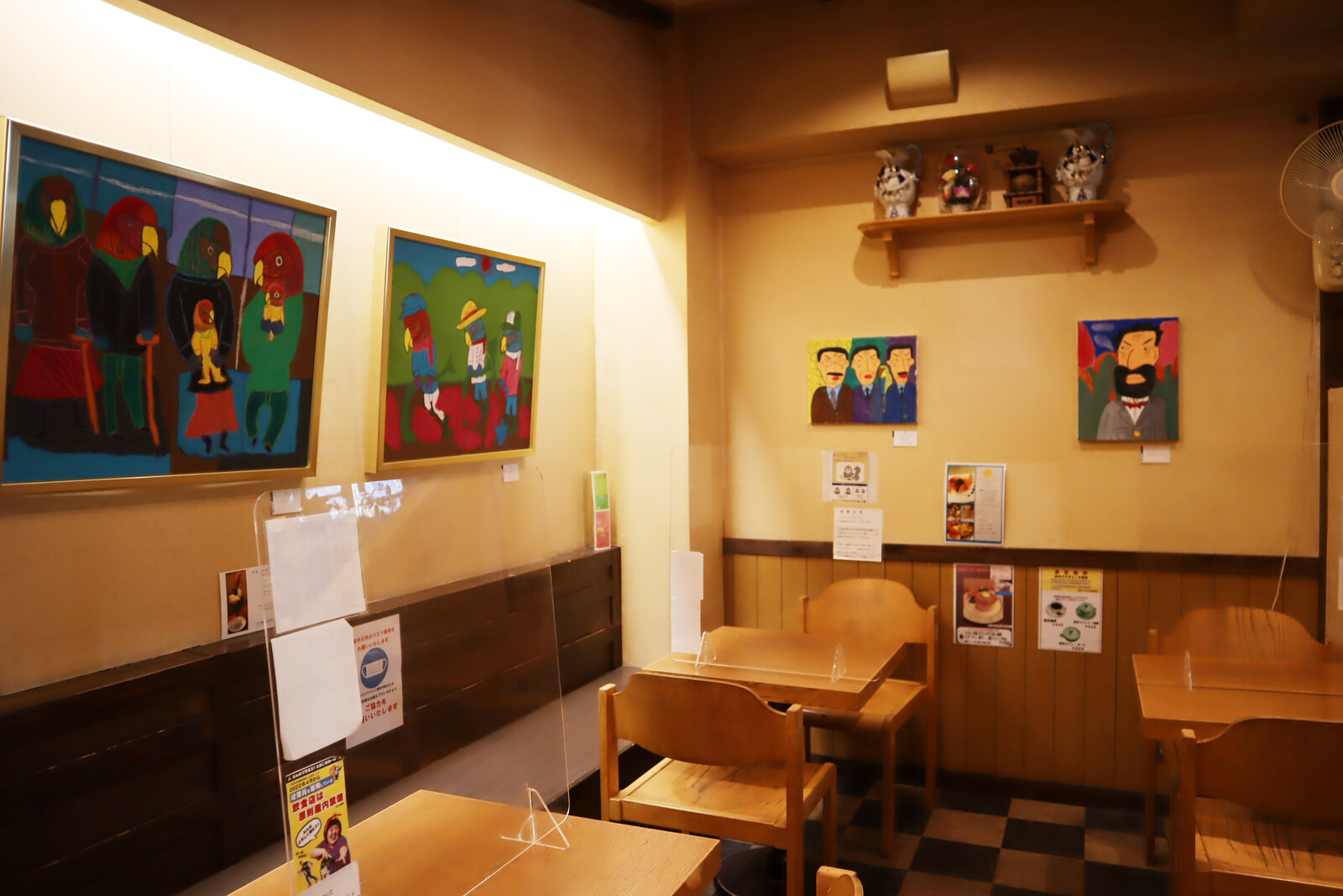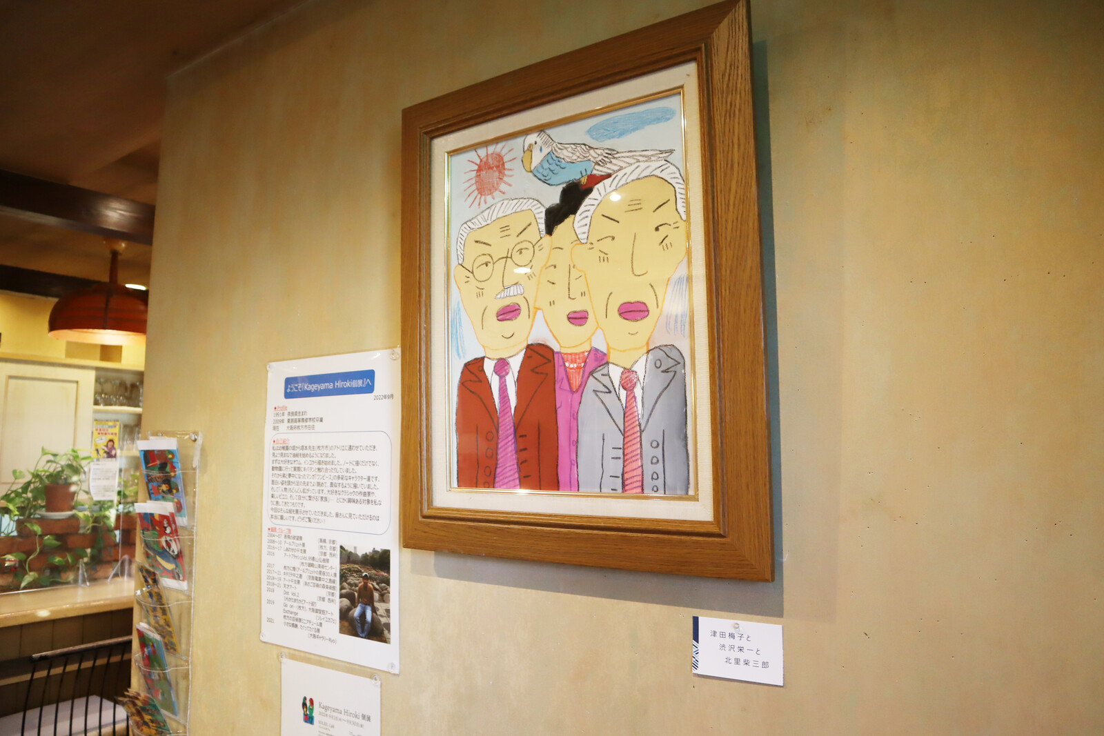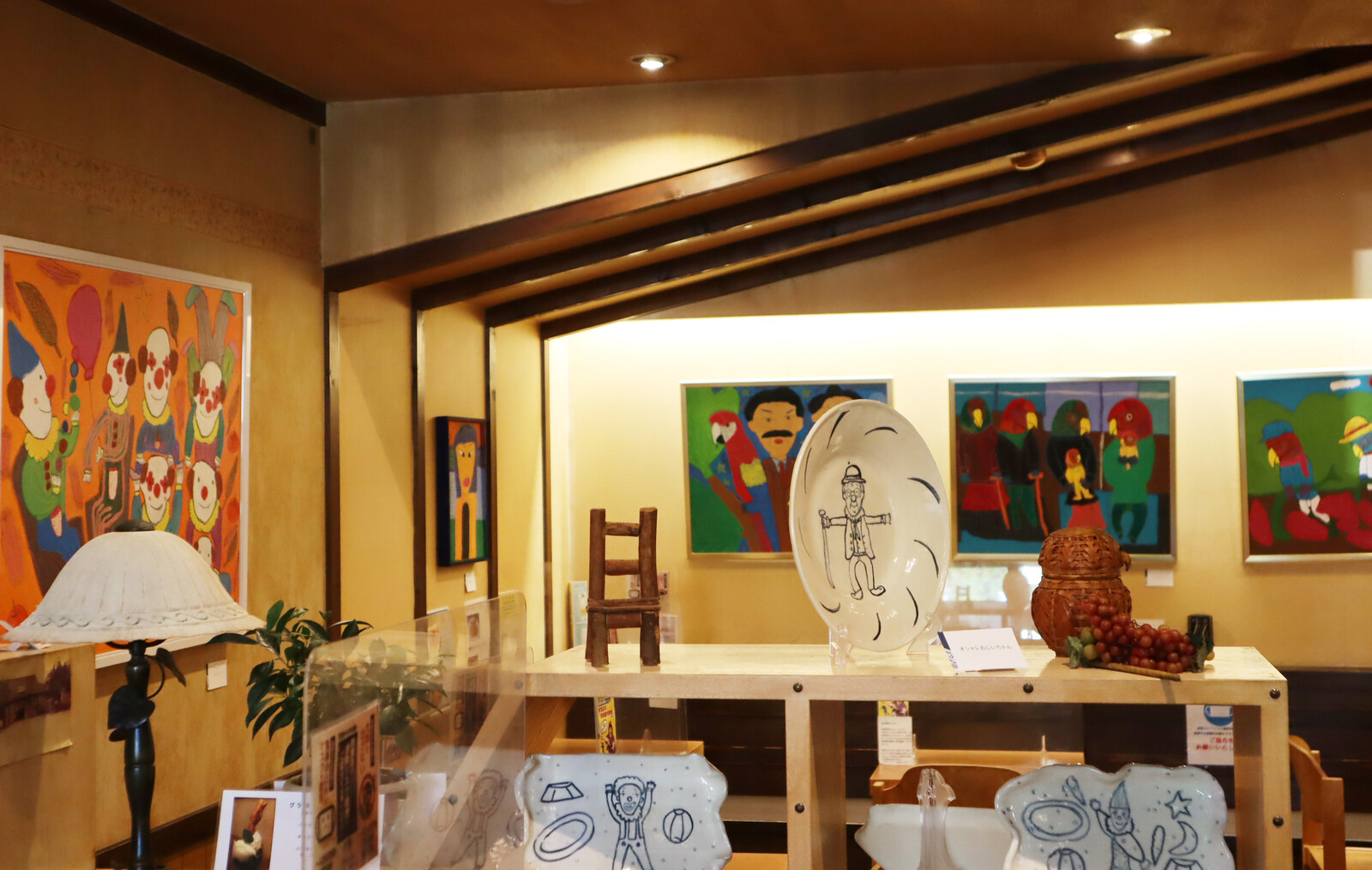 カフェスペースの壁に、カラフルでチカラ強いタッチの作品が並んでいました。