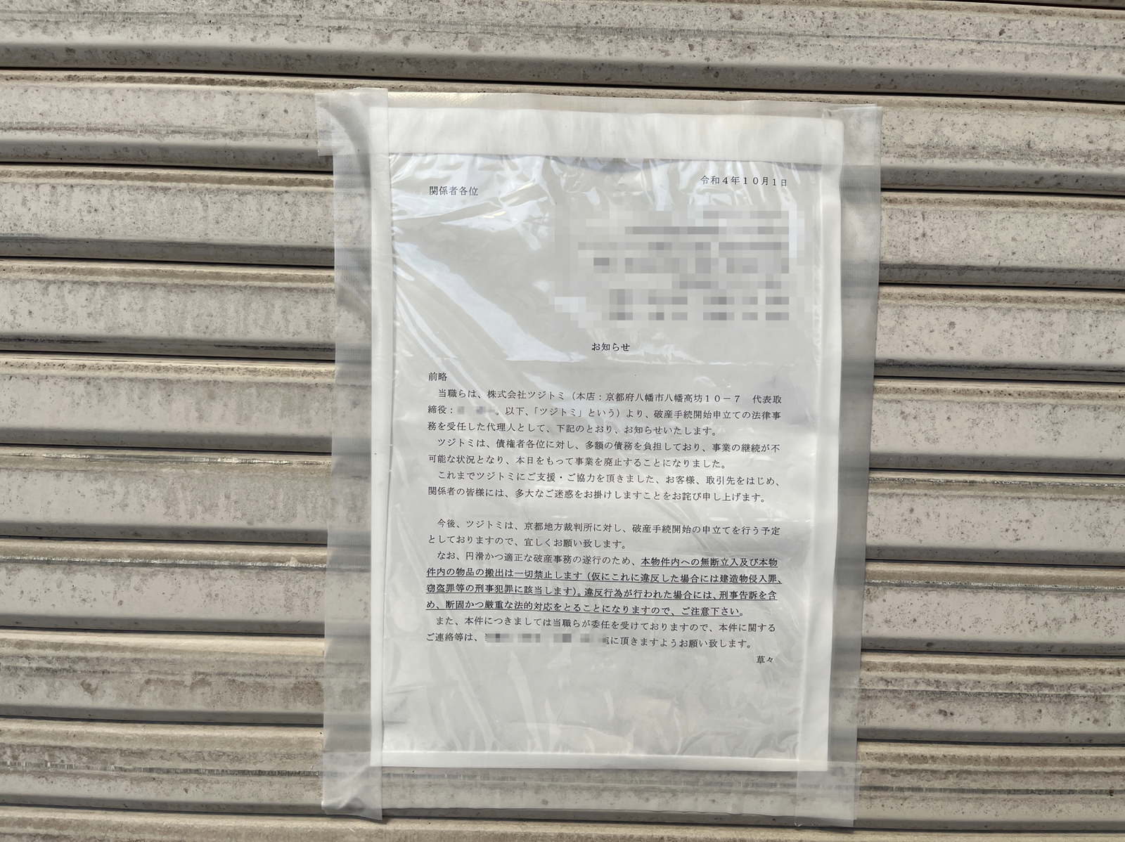 ・本日(貼り紙の日付は10月1日)をもって事業を廃止することになった