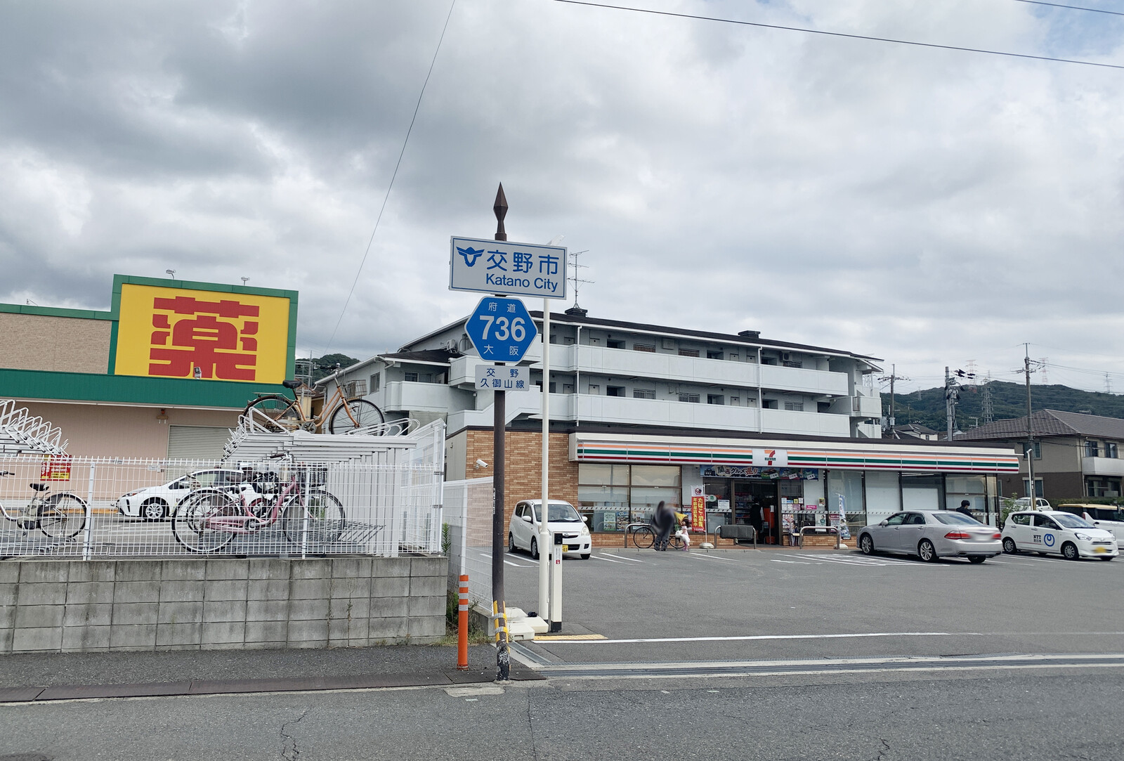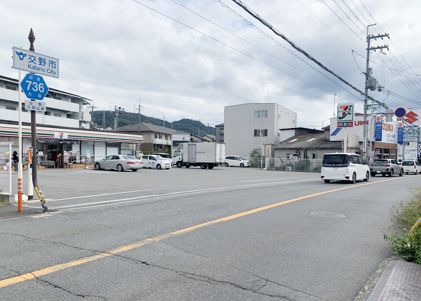 JR津田駅から、その前を通る「交野久御山線」沿いに、セブンイレブン倉治7丁目店のある方向に歩いてみます。