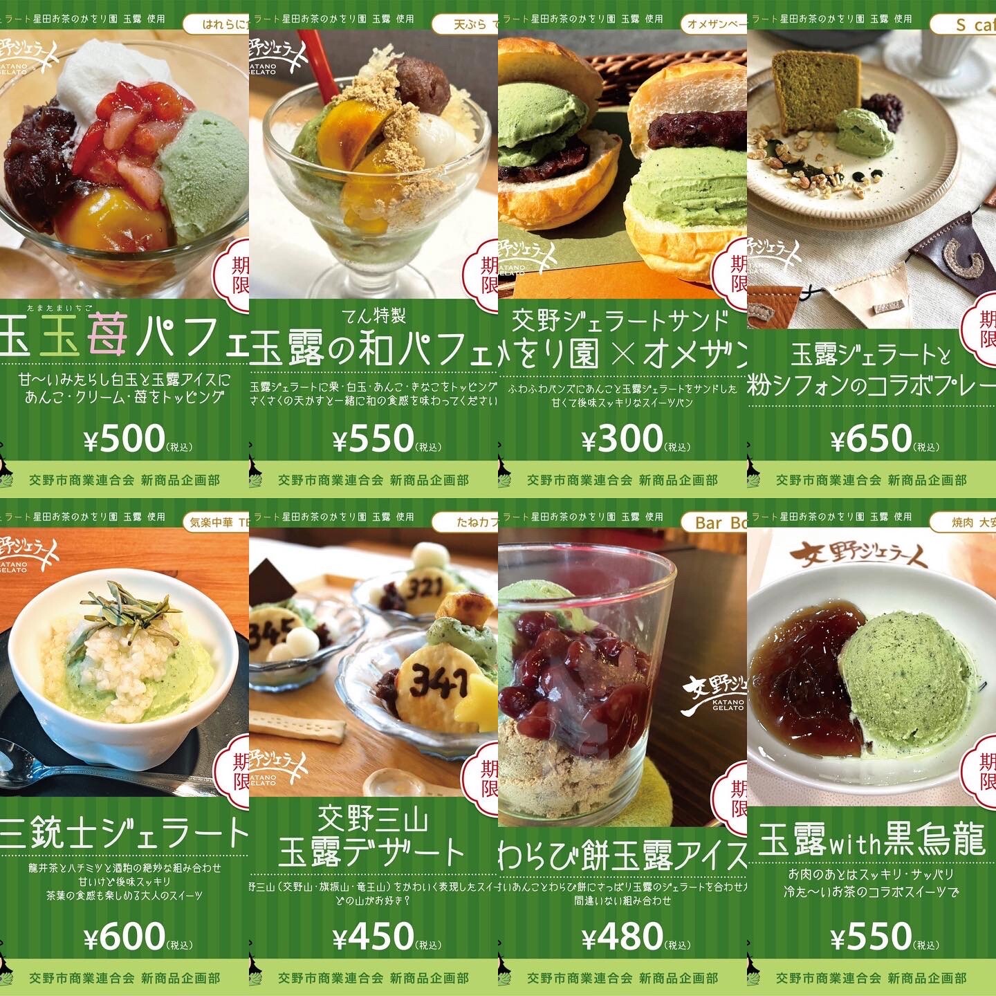 そんな交野ジェラートの中から、今回、星田にあるお茶のかをり園提供の玉露を使ったジェラートを使って、交野市内8店舗がオリジナルのデザートを提供しています。