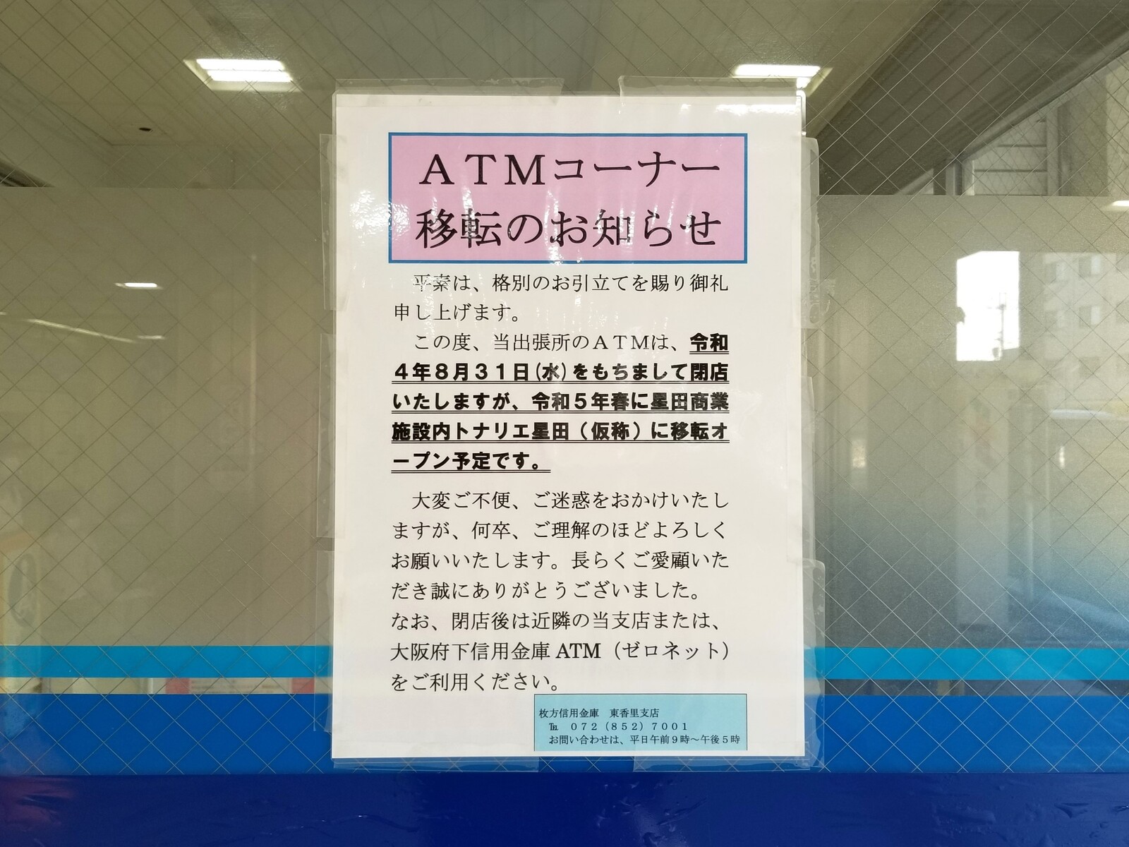 お問い合わせは、閉店のお知らせが出ていた時と変わらず東香里支店へとのことです。