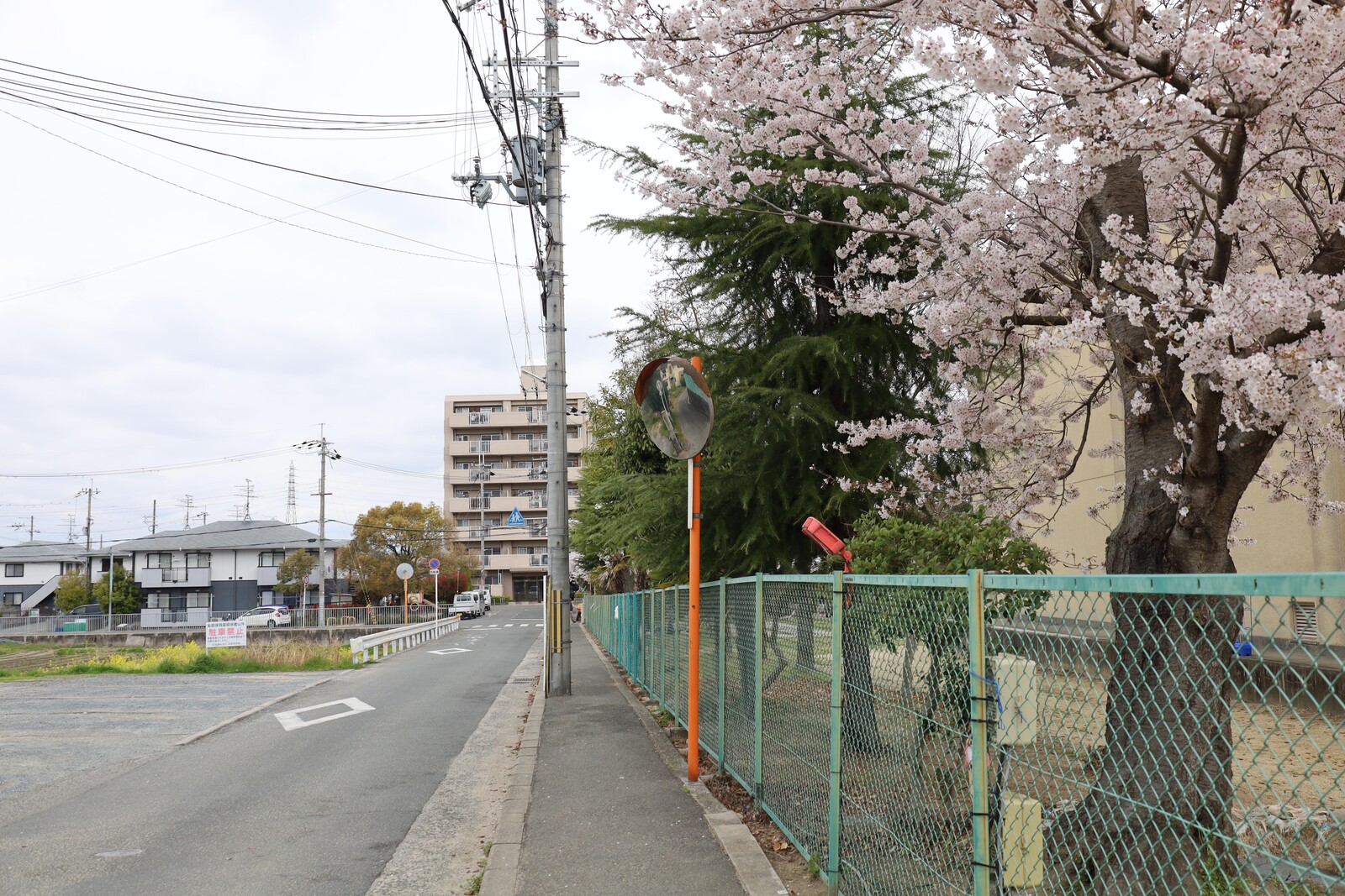 体育館横のフェンスの側にある桜の木と学校横の道です。