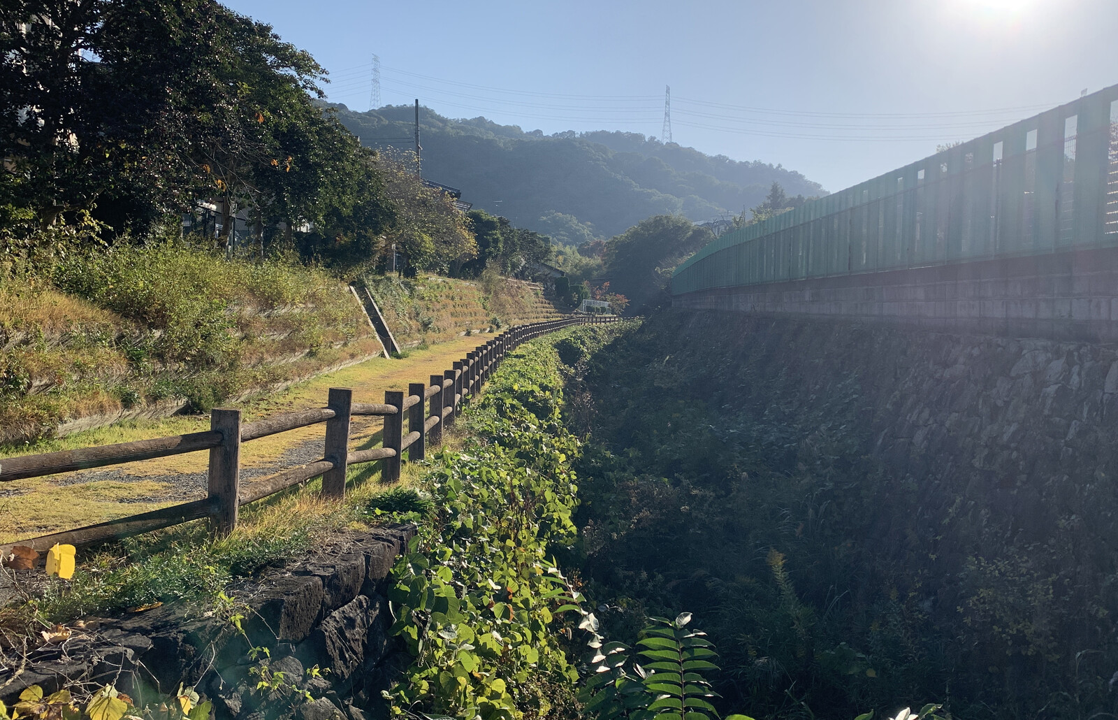 川を挟んで、フェンスの奥は地域の墓地です。