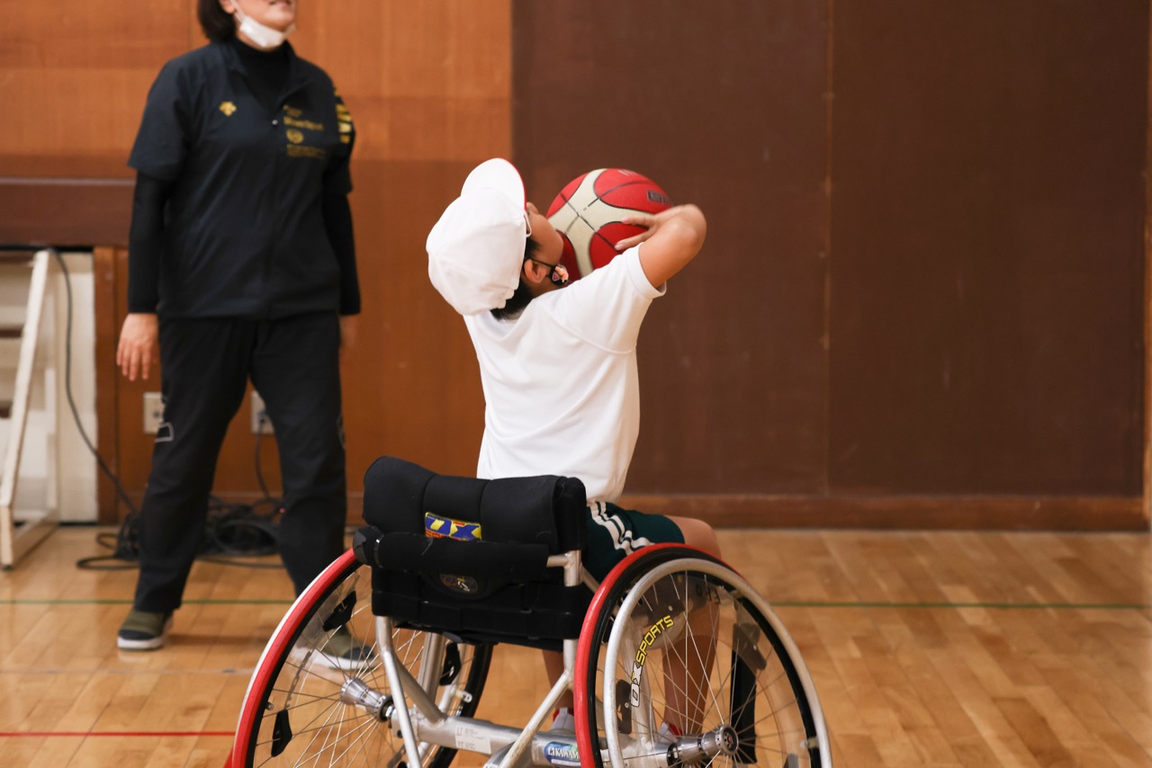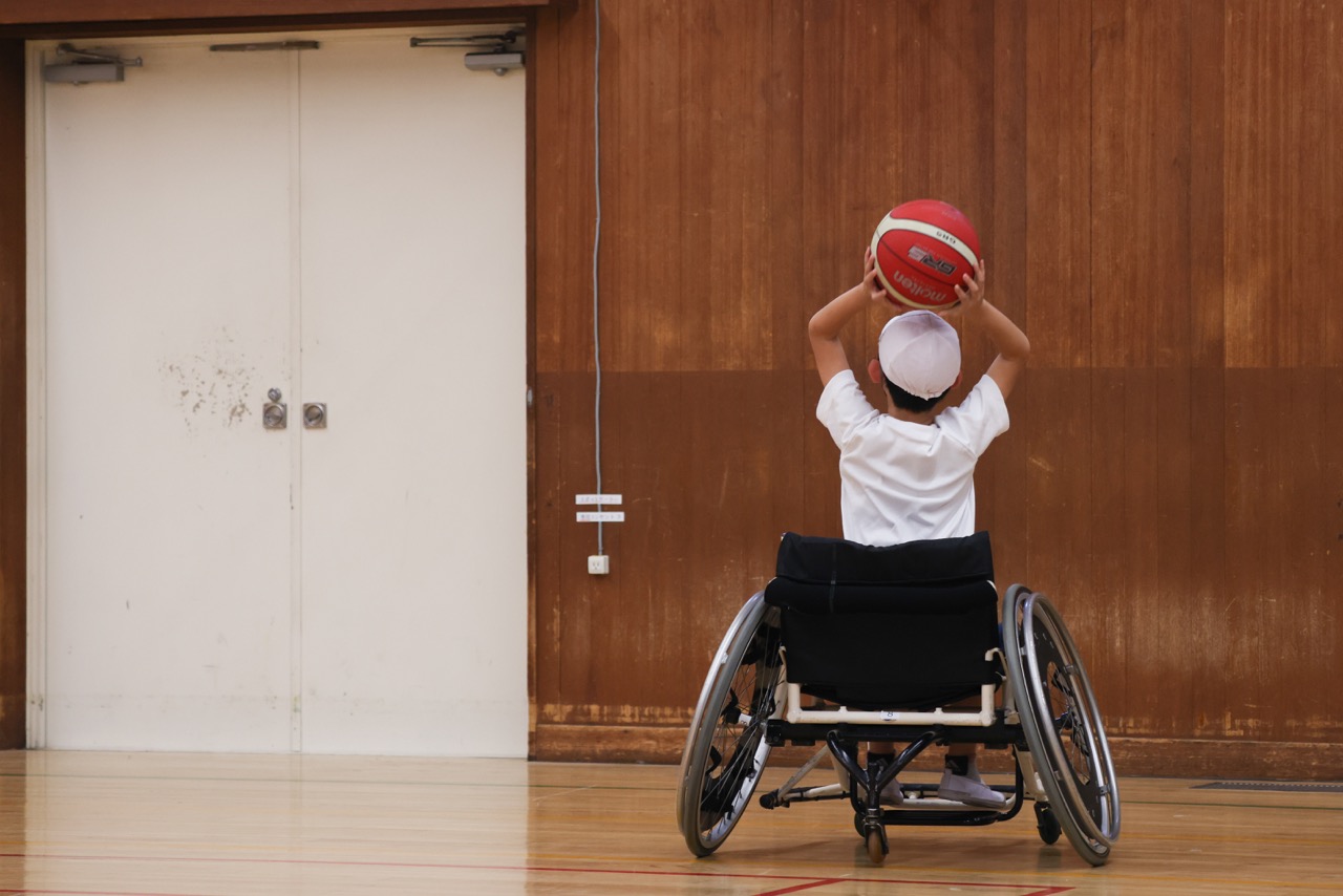 文字で書くと簡単そうに思えますが、車椅子を動かしながら小学生にはまだ重たいバスケットボールを投げるのは一苦労です。
