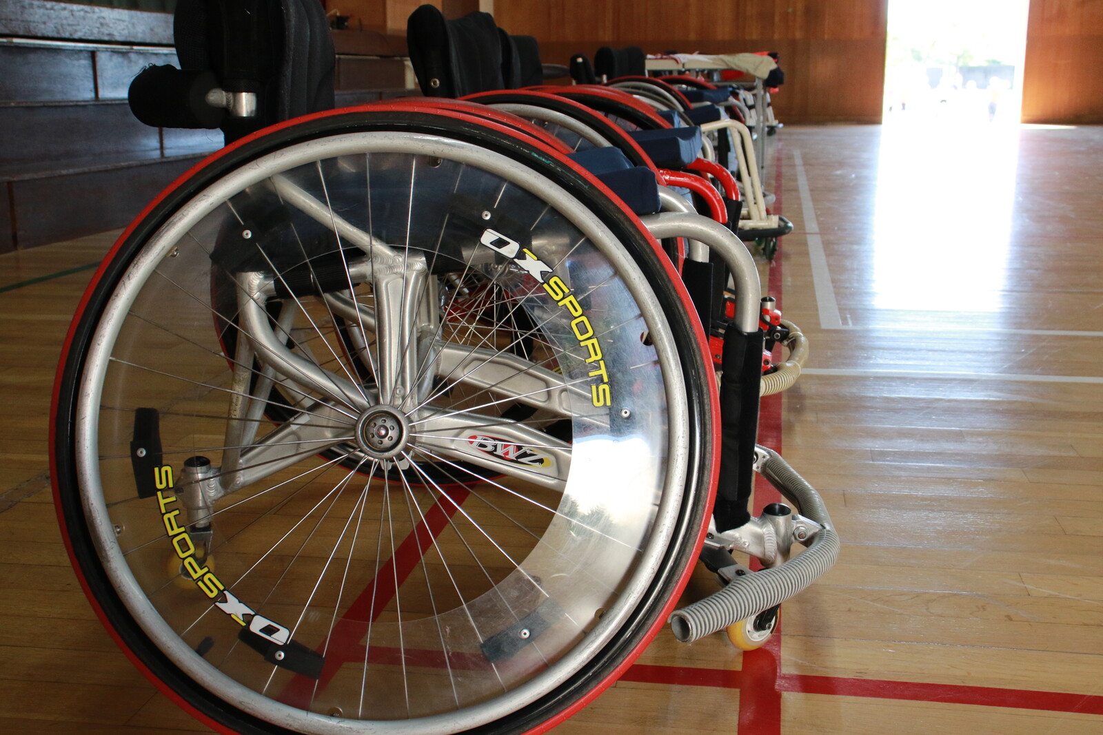 会場となった藤が尾小学校の体育館には、車椅子バスケットボール用の車椅子がずらり。