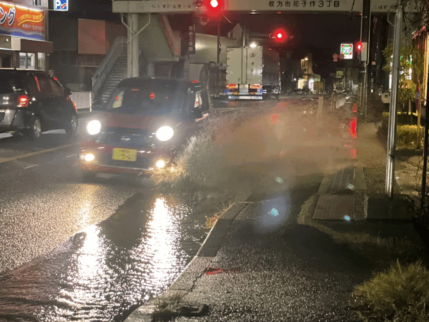 大雨の影響で道路が噴水みたいになってた。府道18号線、モスバーガー 枚方茄子作店横
