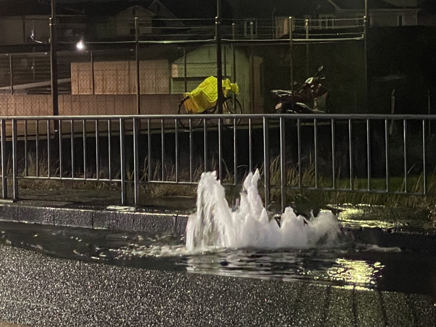 側溝に水が流れ過ぎたオーバフロー状態なのでしょうか、噴水みたいに水が出てきていました。