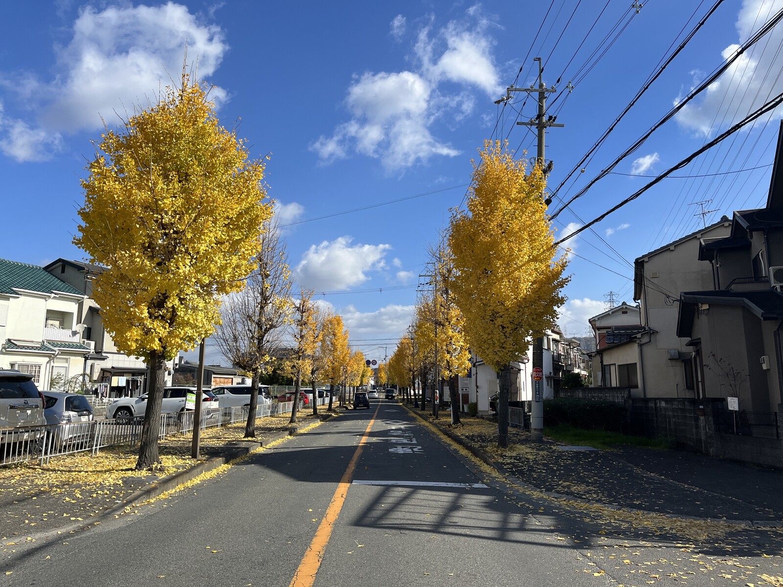 葉っぱが黄色い絨毯みたいに歩道に落ちていて、景色的には綺麗でしたが、付近にお住まいの方が朝からホウキで落ち葉集めをされている姿があり、その作業はちょっと大変そうでした。