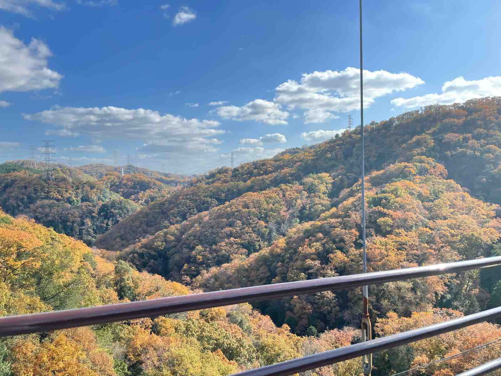 交野の里山は広葉樹が多いので、紅葉のシーズンになると山が赤色というより黄色がかった景色になります。