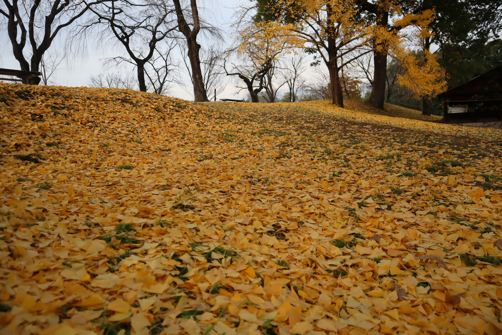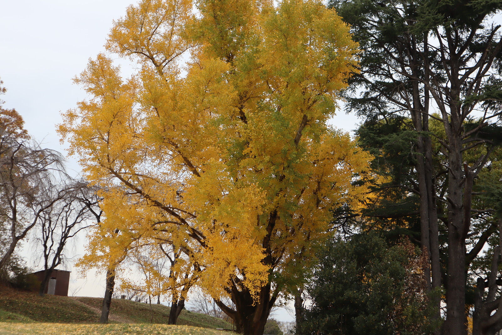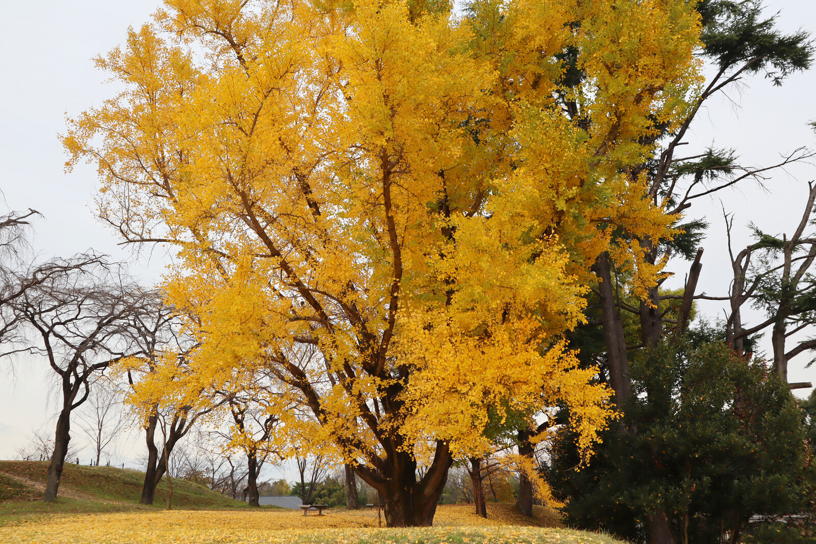 まだ間に合う!大阪公立大学附属植物園の大イチョウの木が見頃。黄金の絨毯になりかけている!