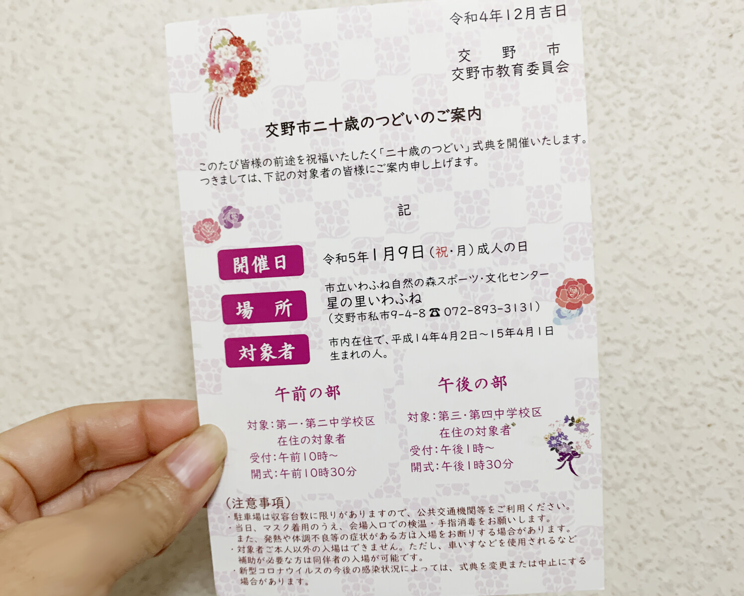 交野市では、市立いわふね自然の森スポーツ・文化センター星の里いわふねにて「交野市二十歳のつどい」が開催されます。