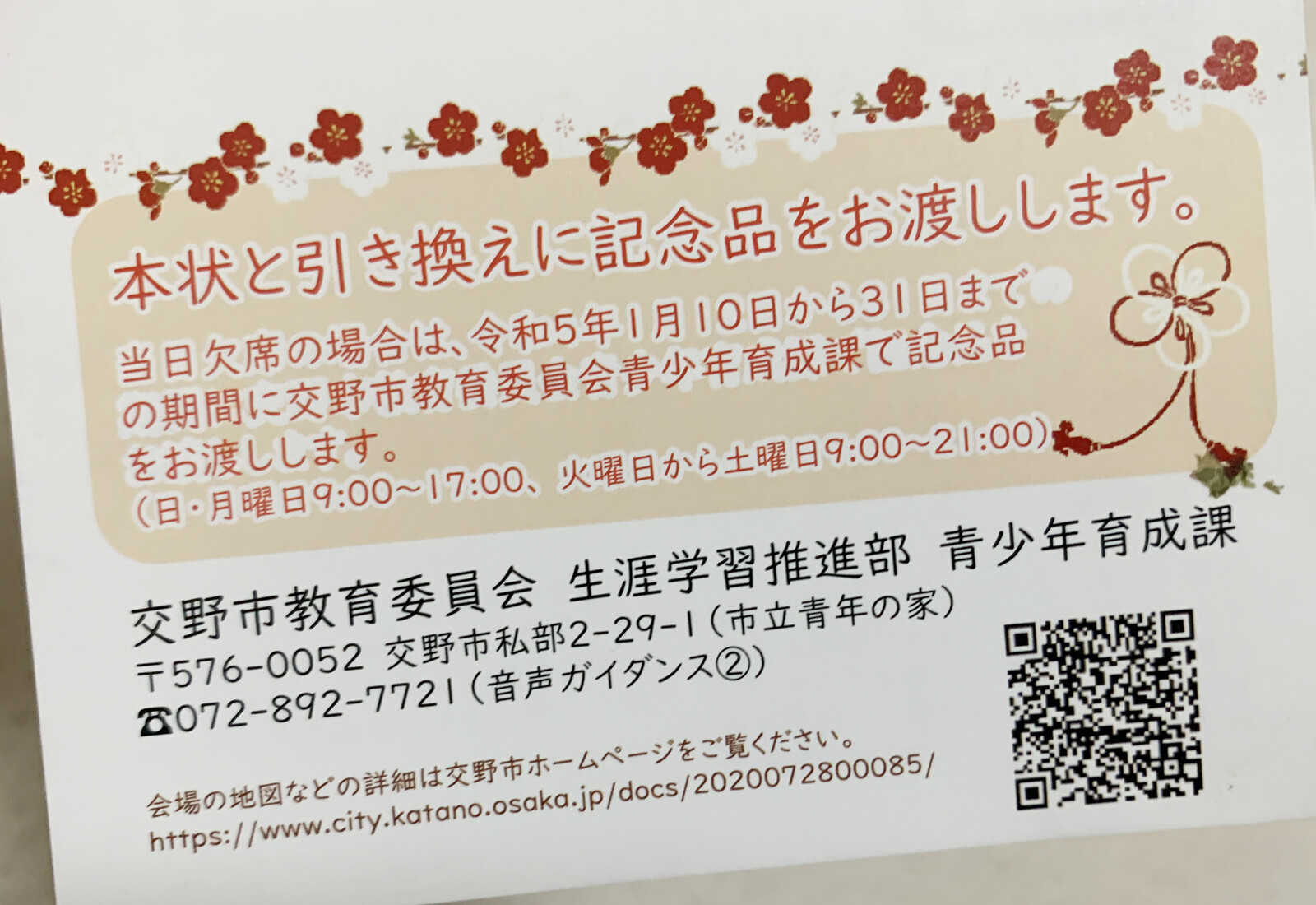 おめでとうございます!1月9日(祝・月)の「交野市二十歳のつどい」はもうすぐだ!