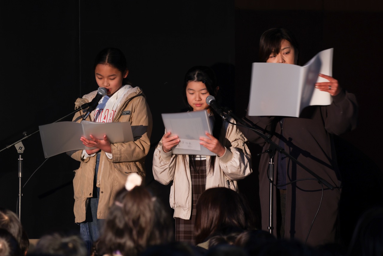 今回、藤が尾小学校6年生の村野花音(かのん)さんが「ナレーター」(写真左)、同じく6年生の大橋依奈(えな)さん(写真中央)が「豆太」役、恒松小百合校長先生が「じさま」と「医者様」役で出演されました。