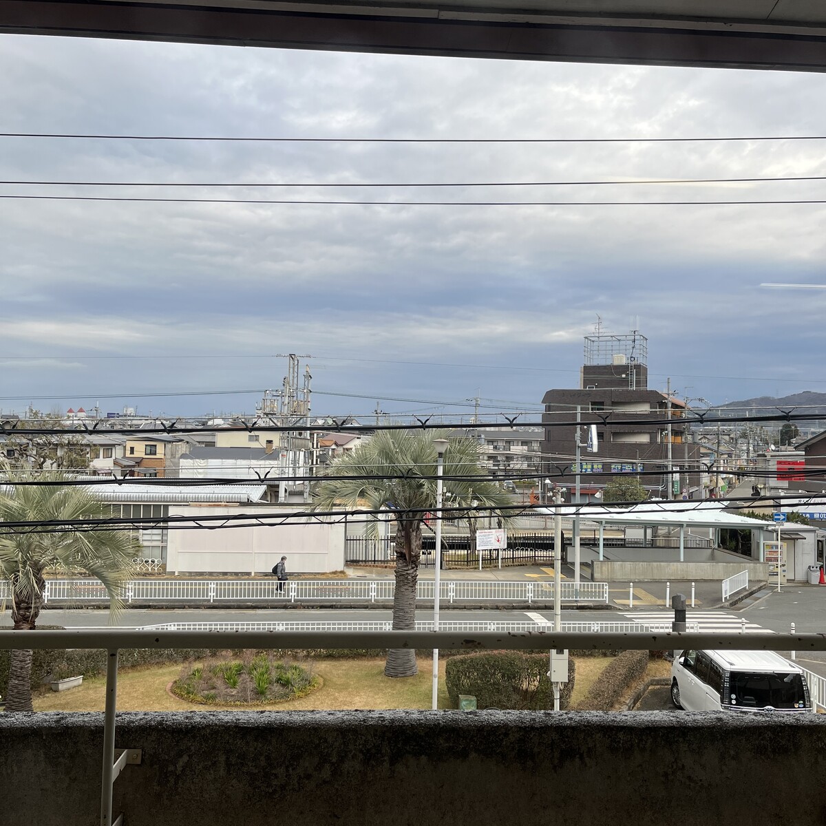 ベランダの柵と軒のアスファルトがコンクリートなので光の加減や写真の撮り方によってはこんな感じで黒っぽいグレーに見えるので、そこからの景色がちょっと映画の景色みたいに見えなくもないです。