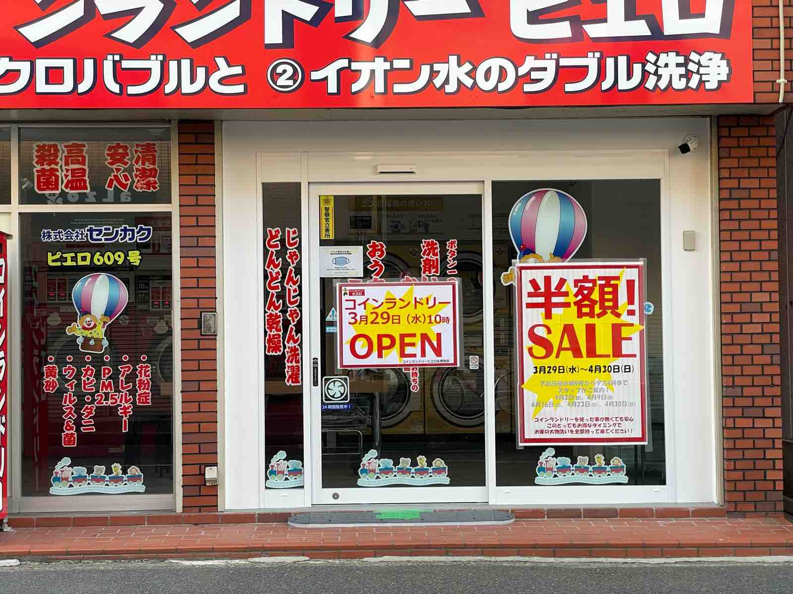 店舗の前面に大きく「3/29 OPEN」と「3/29〜4/30まで半額セール」の文字。