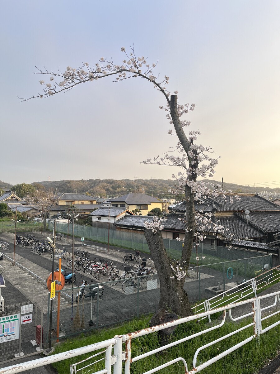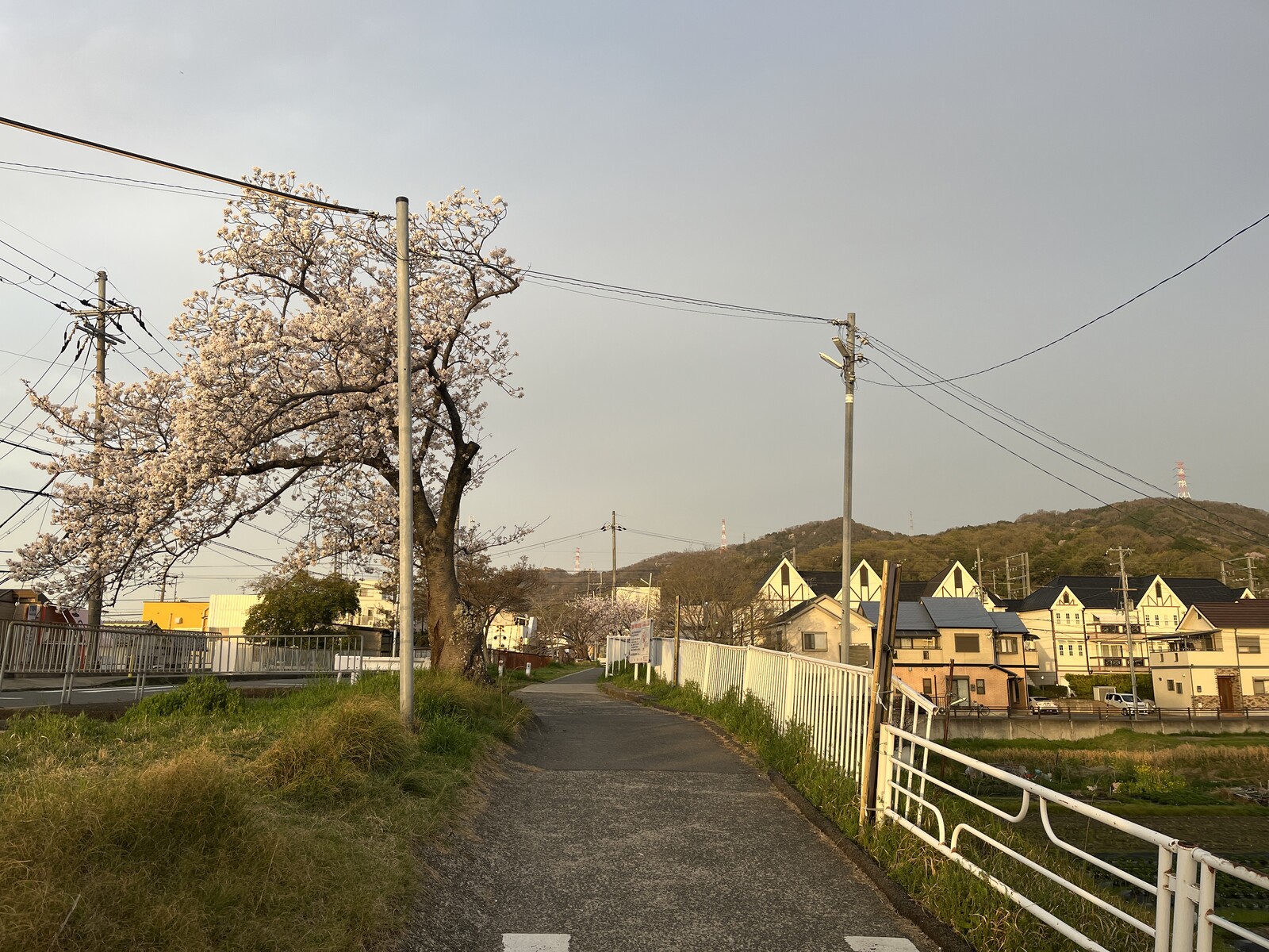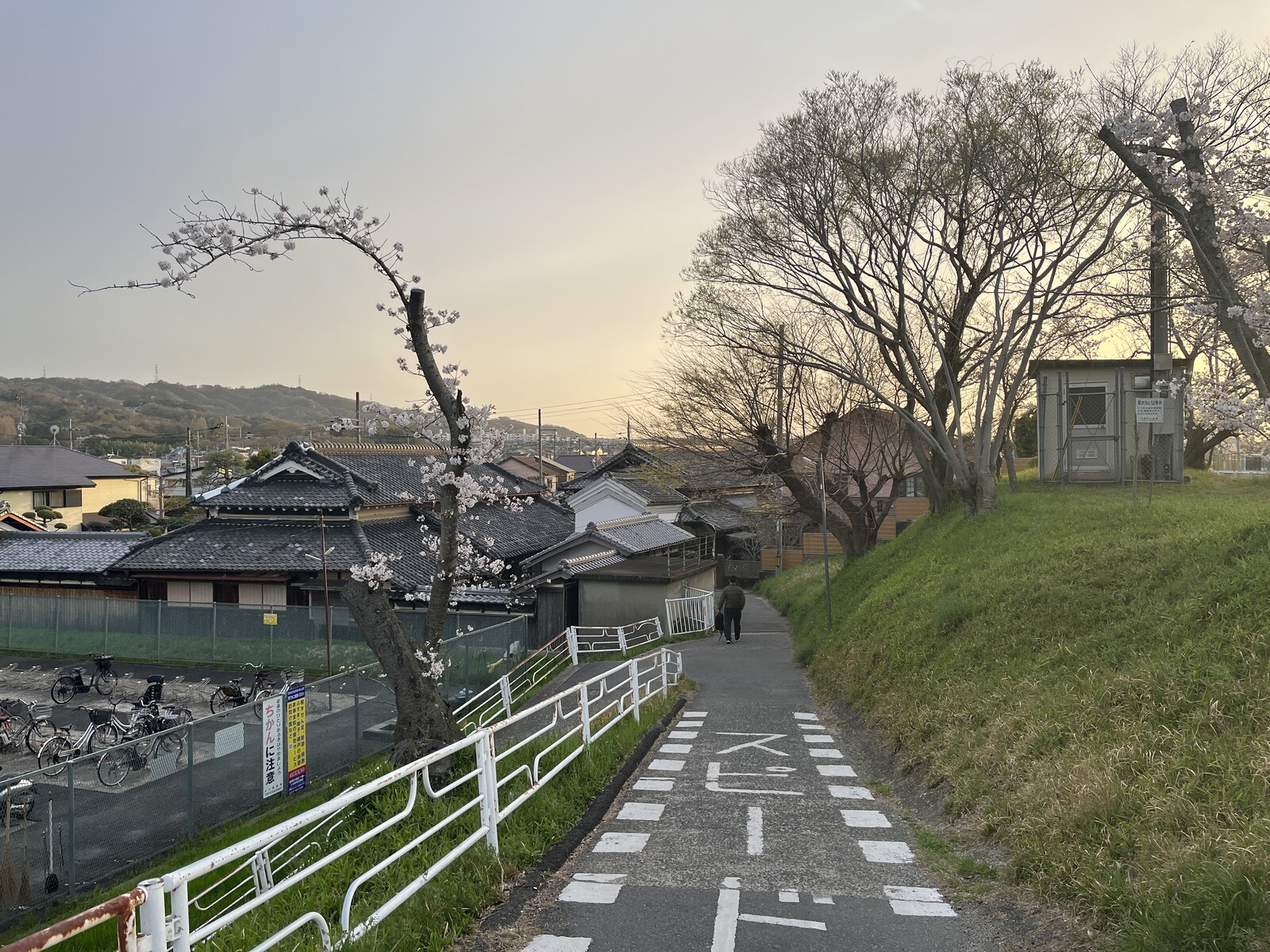 今回ご紹介させていただく、桜のスポットはここからすぐのところ、スロープをおりて、河内森駅西自転車駐車場の入り口付近にある桜の木です。