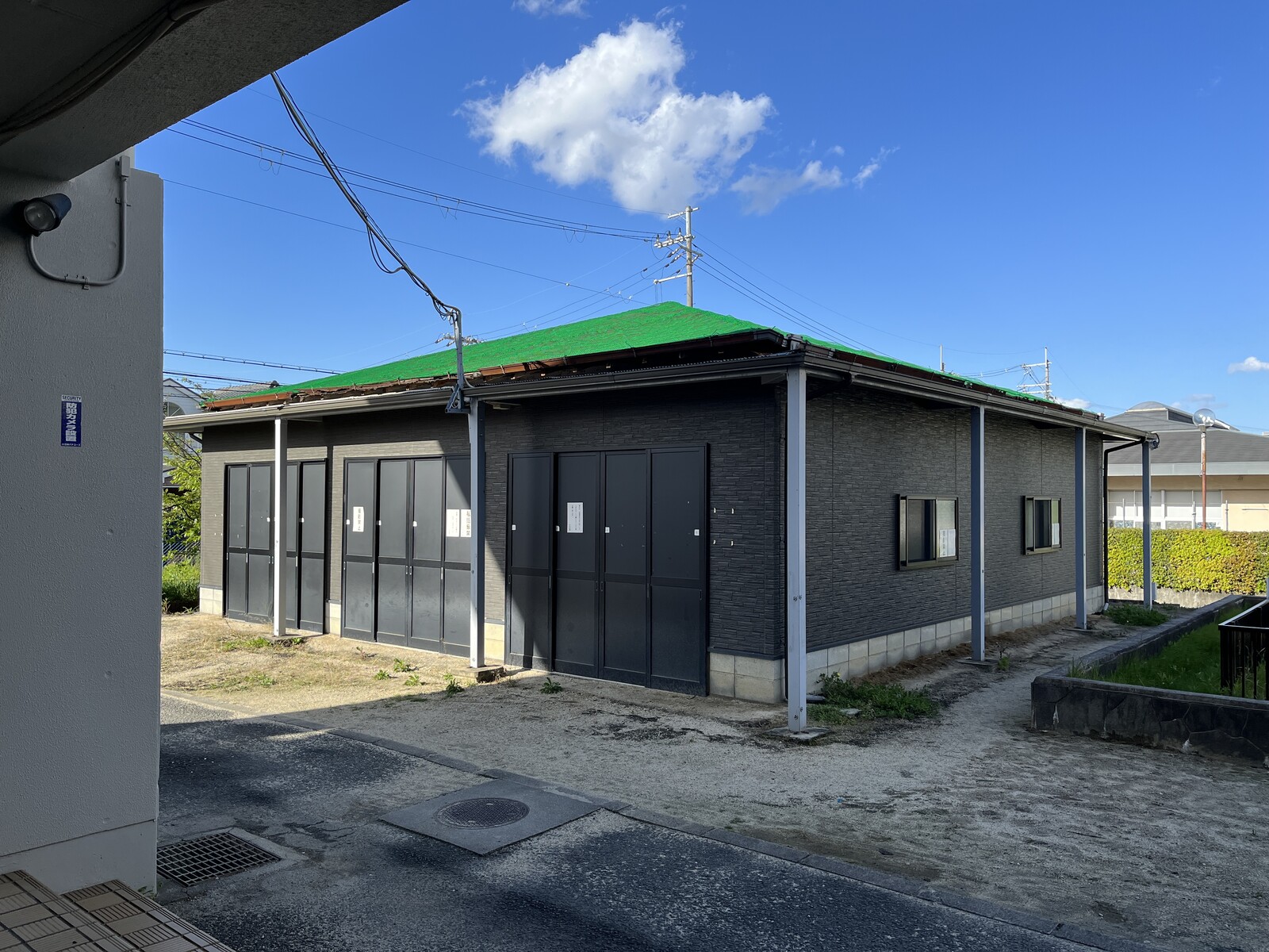 近くにお住まいの方に話を聞いてみると、どうやら老朽化か何かで屋根の材料が風とかで飛んでいってしまったり落ちていったりするそうで、グリーンのネットを被せて養生しているとのこと。