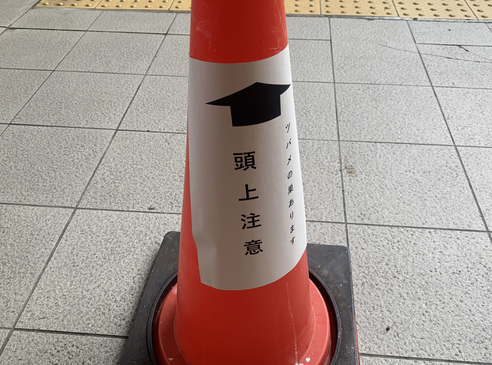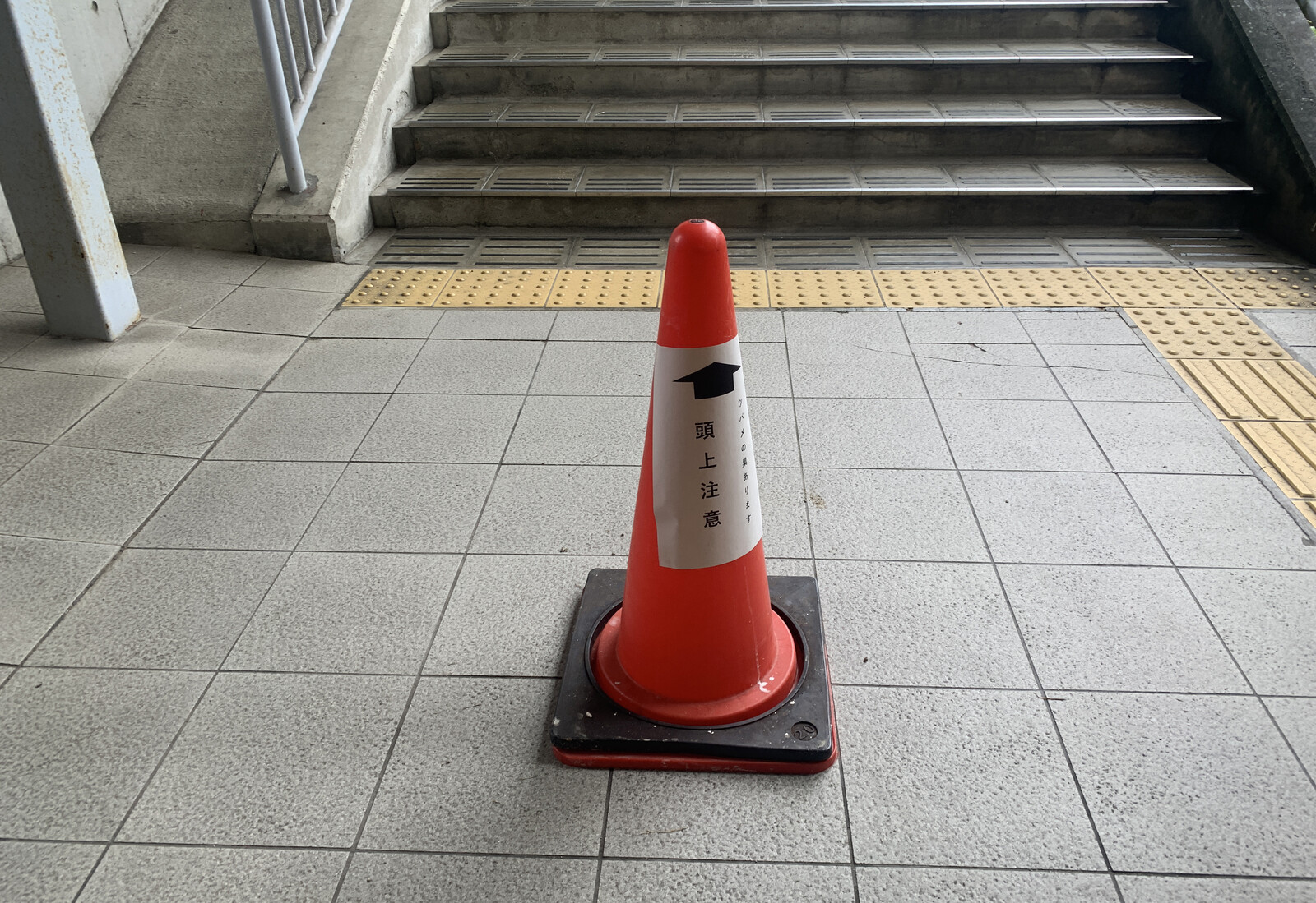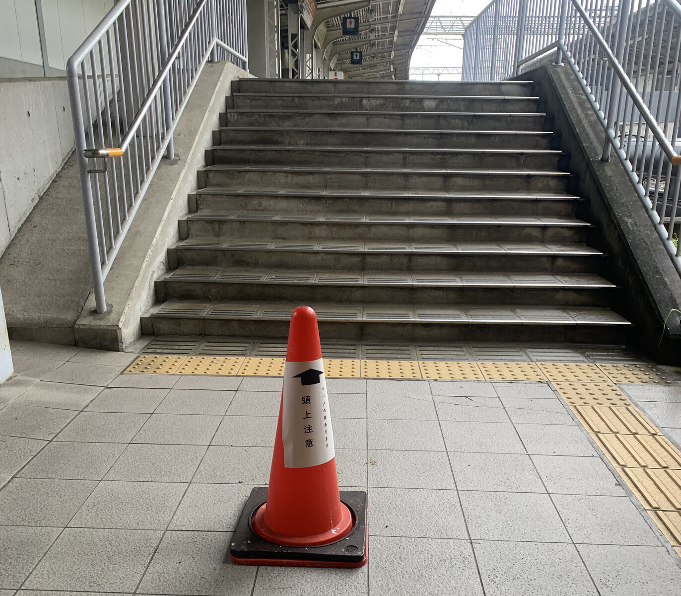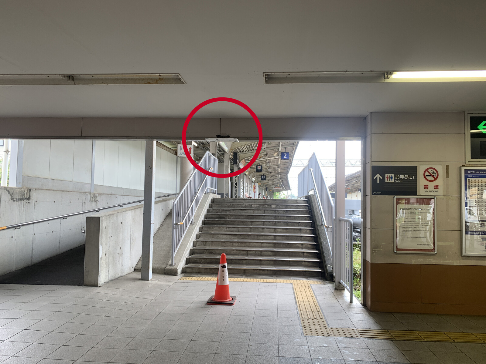2番線ホームに行く階段の手前に赤いコーンが置いてありました。