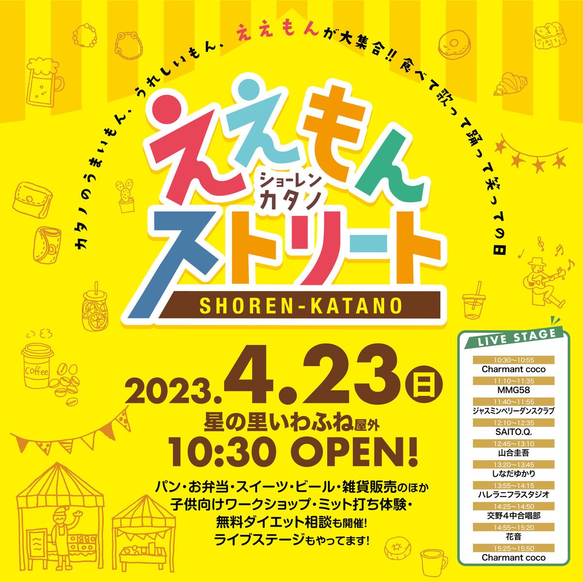 今日!4/23(日)星の里いわふねで『ええもんストリート』と『北河内新人お笑いコンクール』開催!漫才とかお買い物とかライブとか!