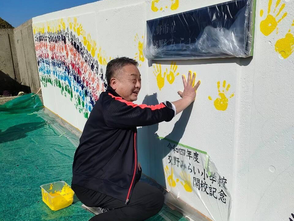 保護者の皆さんや施工業者の株式会社さくらのお手伝いで次々に緑の手形を押していく子ども達。