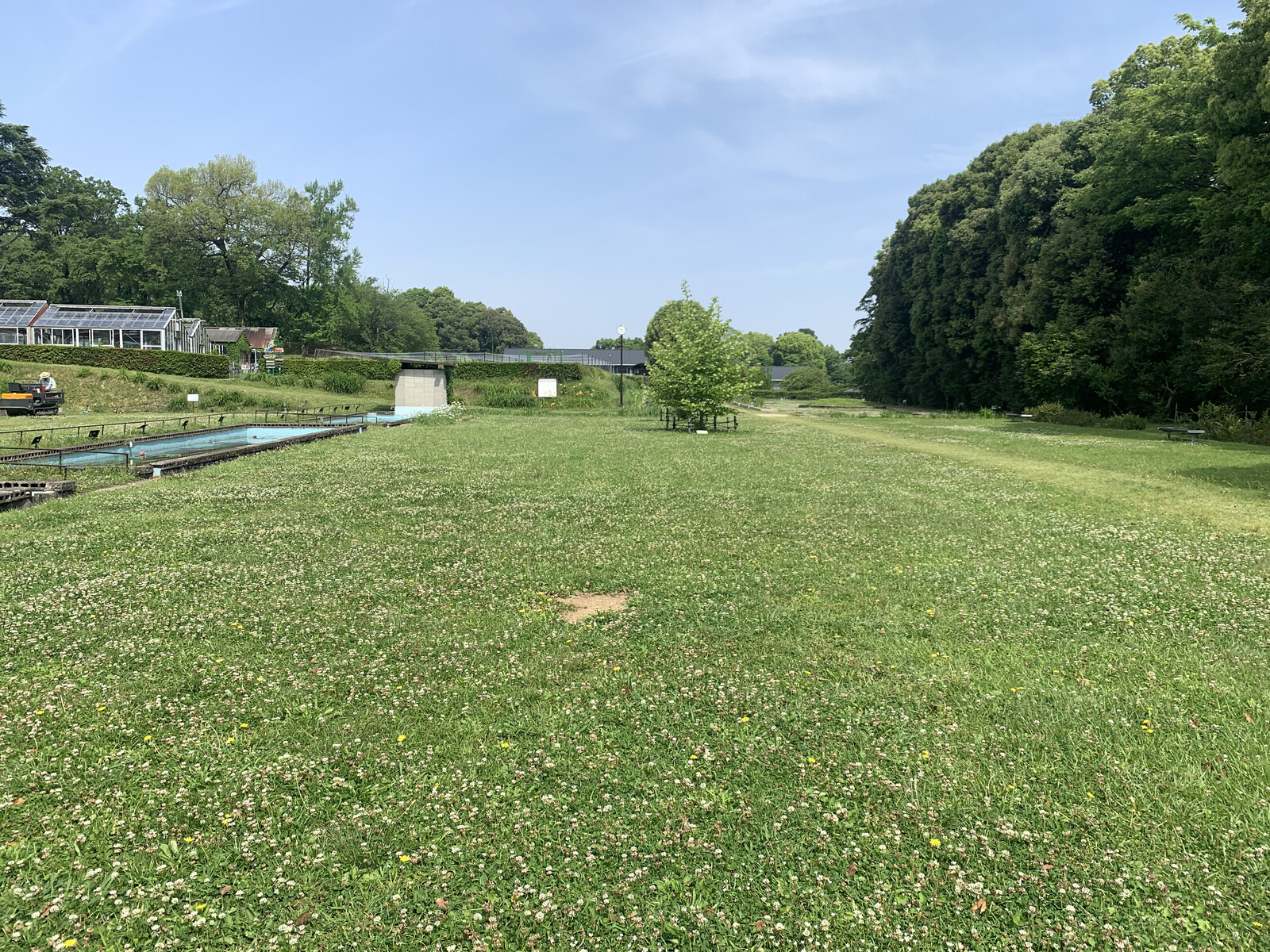 入り口入って、右手のほうにすすむと、今はシロツメグサが一面に。
