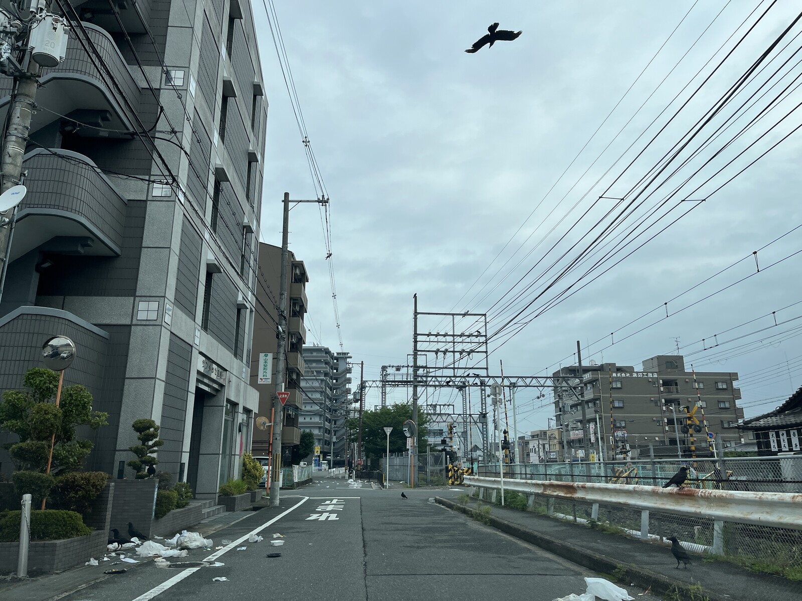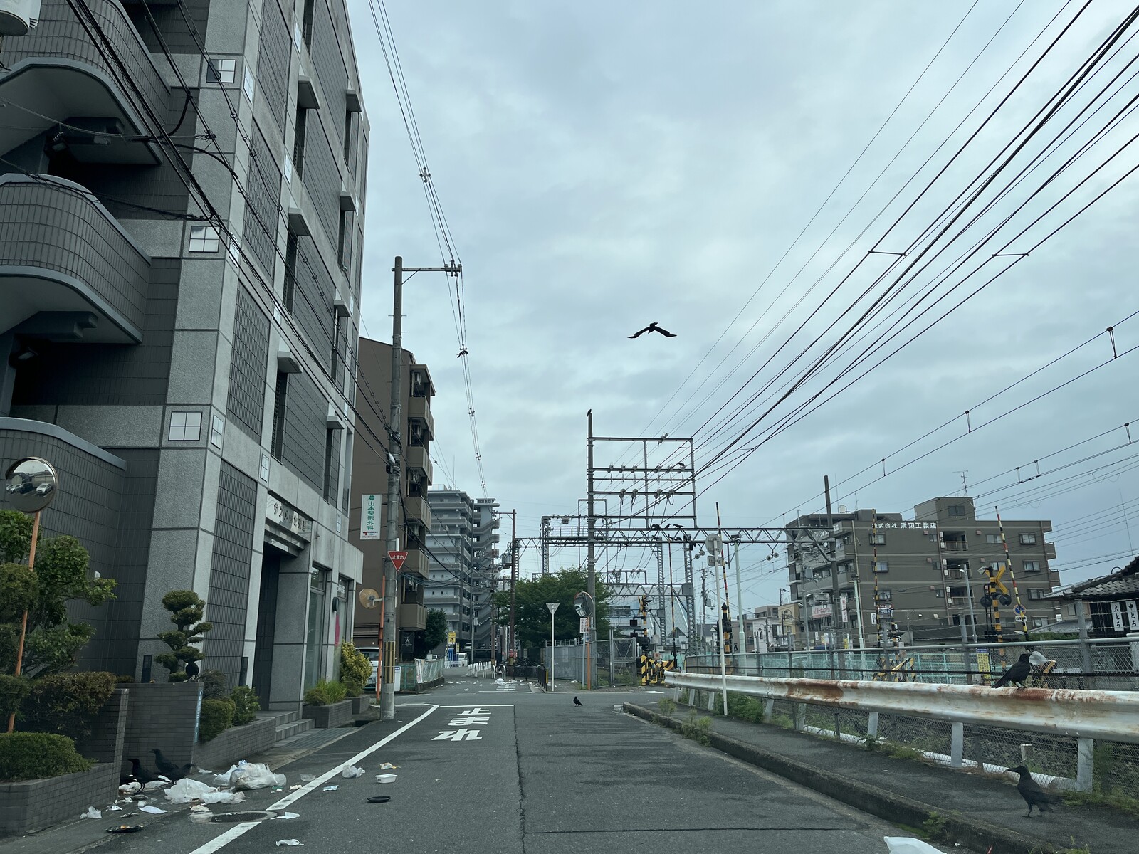 交野市駅近く、線路沿いの道のところにゴミが散乱していて、カラスが数羽ゴミ袋を破いたり、中のモノを出したりしてました。
