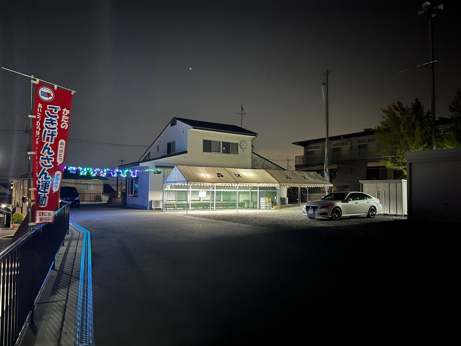 そうじゃなくって、写真だとすごくわかりづらいのですが、「森区盆おどり大会」って書かれたところにイルミネーションがあったので、おそらく、盆踊り大会のライトアップの一時的な装飾確認か何かだったのかと思います(毎夜光っているかはすいません、未確認)。