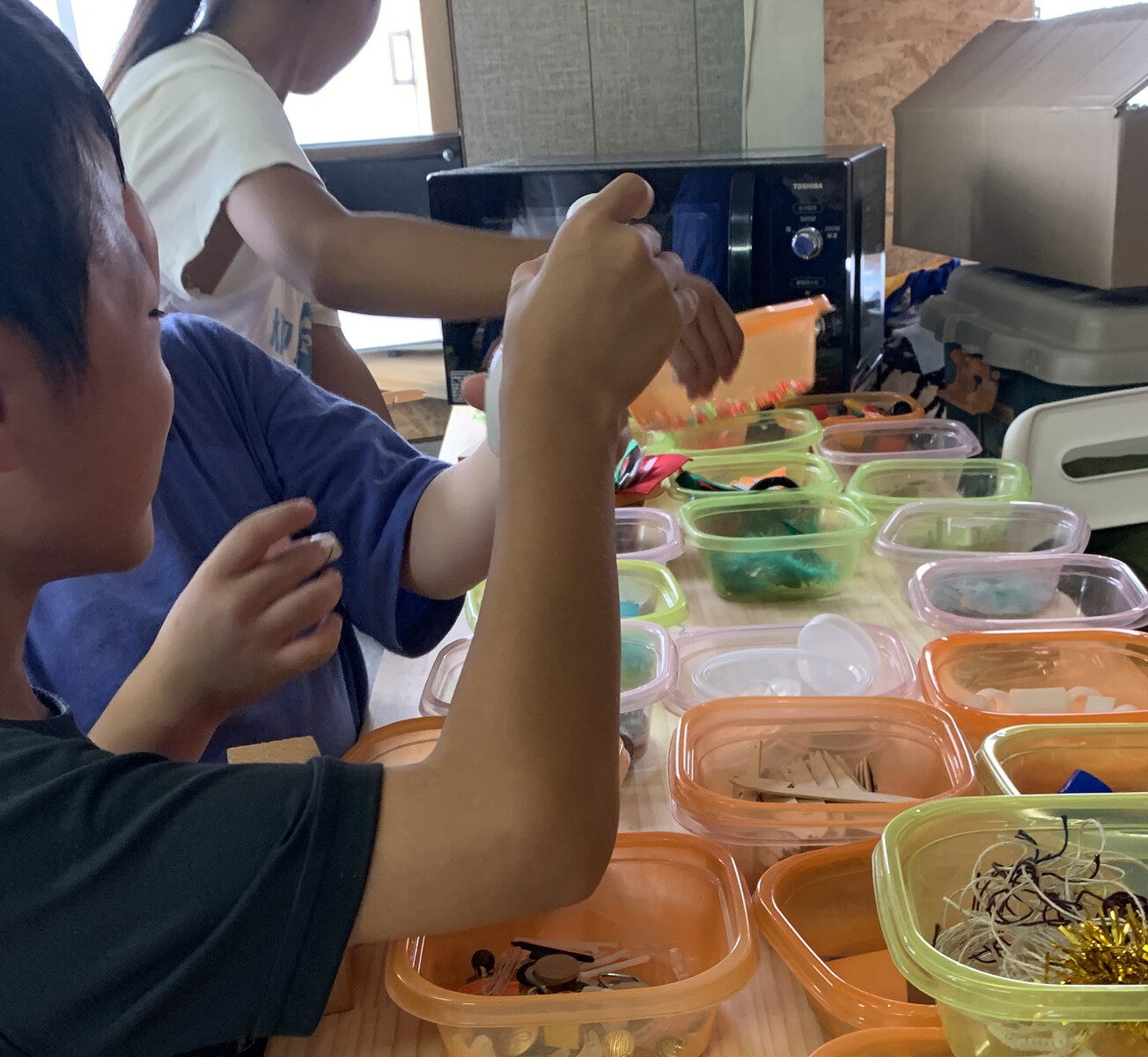 たくさんの素材(リサイクルの廃材を利用したものが中心)を組み合わせて、おもいおもいに作品を作ります。