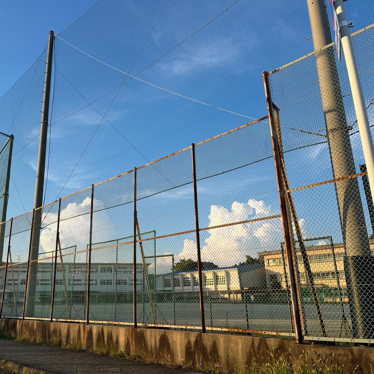 夏休みの夕方、フェンス越しにみたグラウンドには人影はなく、一方、空は、青色と白色のコントラストが賑やかで、その対比の情景がちょっとセンチメンタルで一瞬心が熱くなりました。