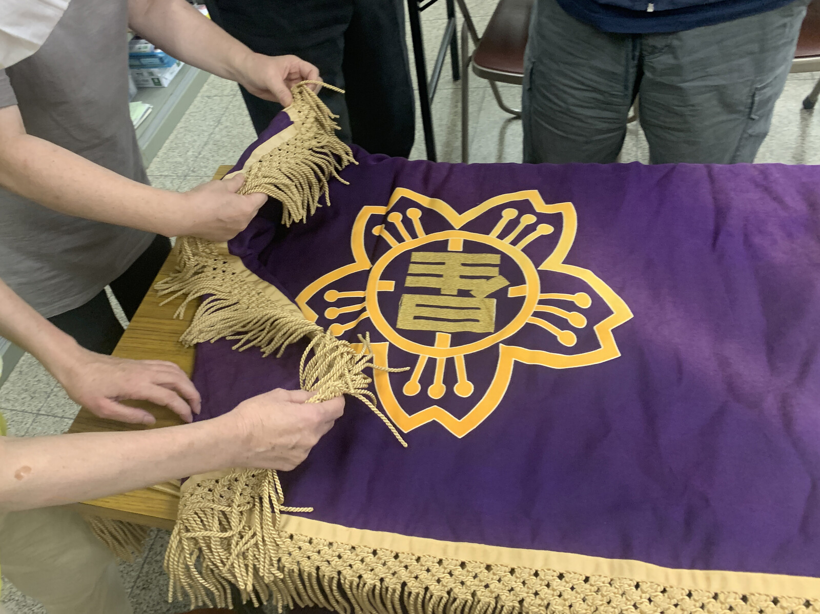 今でもキレイなまま大切に保存されている昔の「校旗」を見せていただきました。