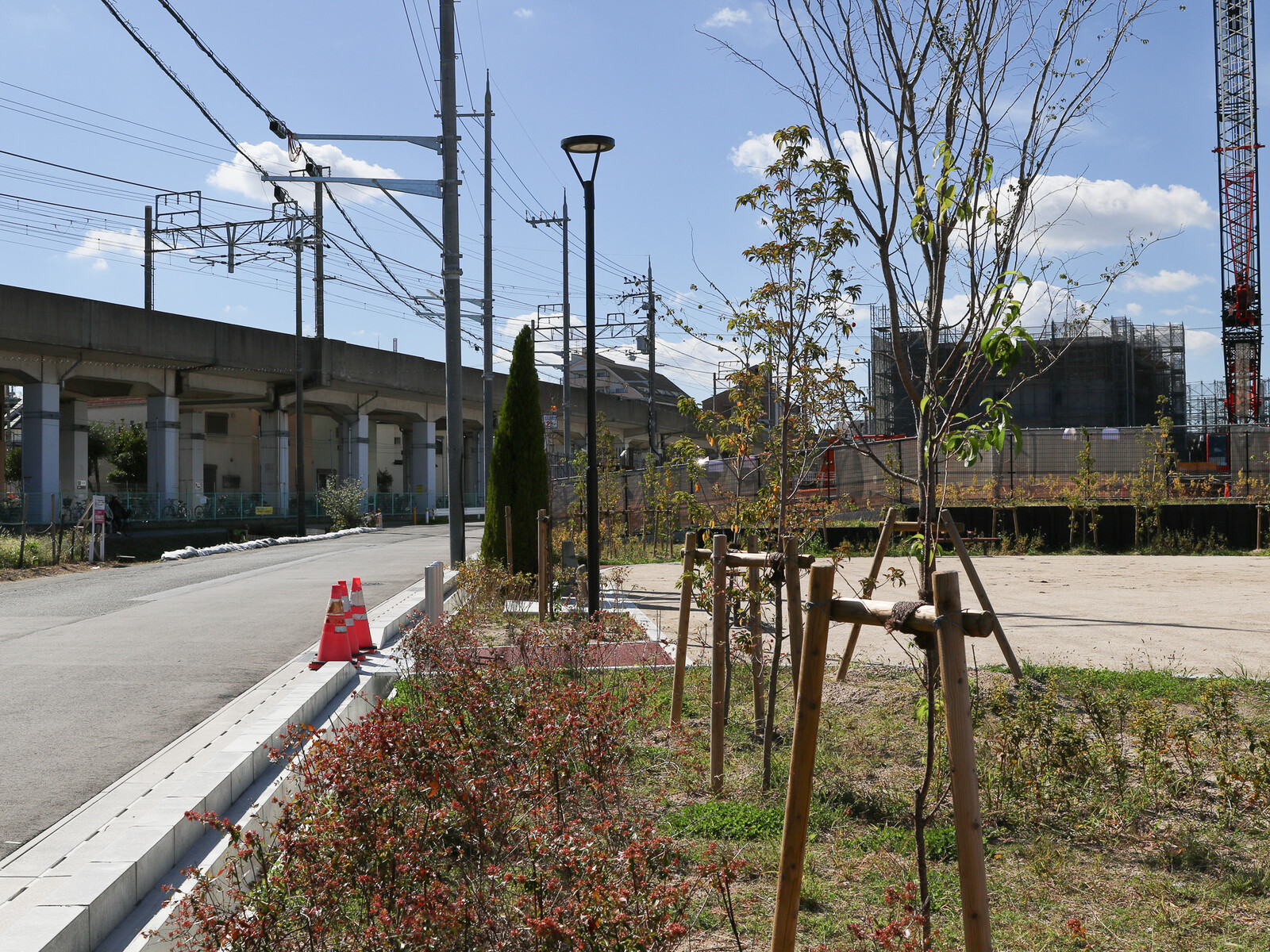 後ろに見えているクレーンは、JR星田駅前に建設中の新設マンション「シエリアシティ星田駅前」のもの。