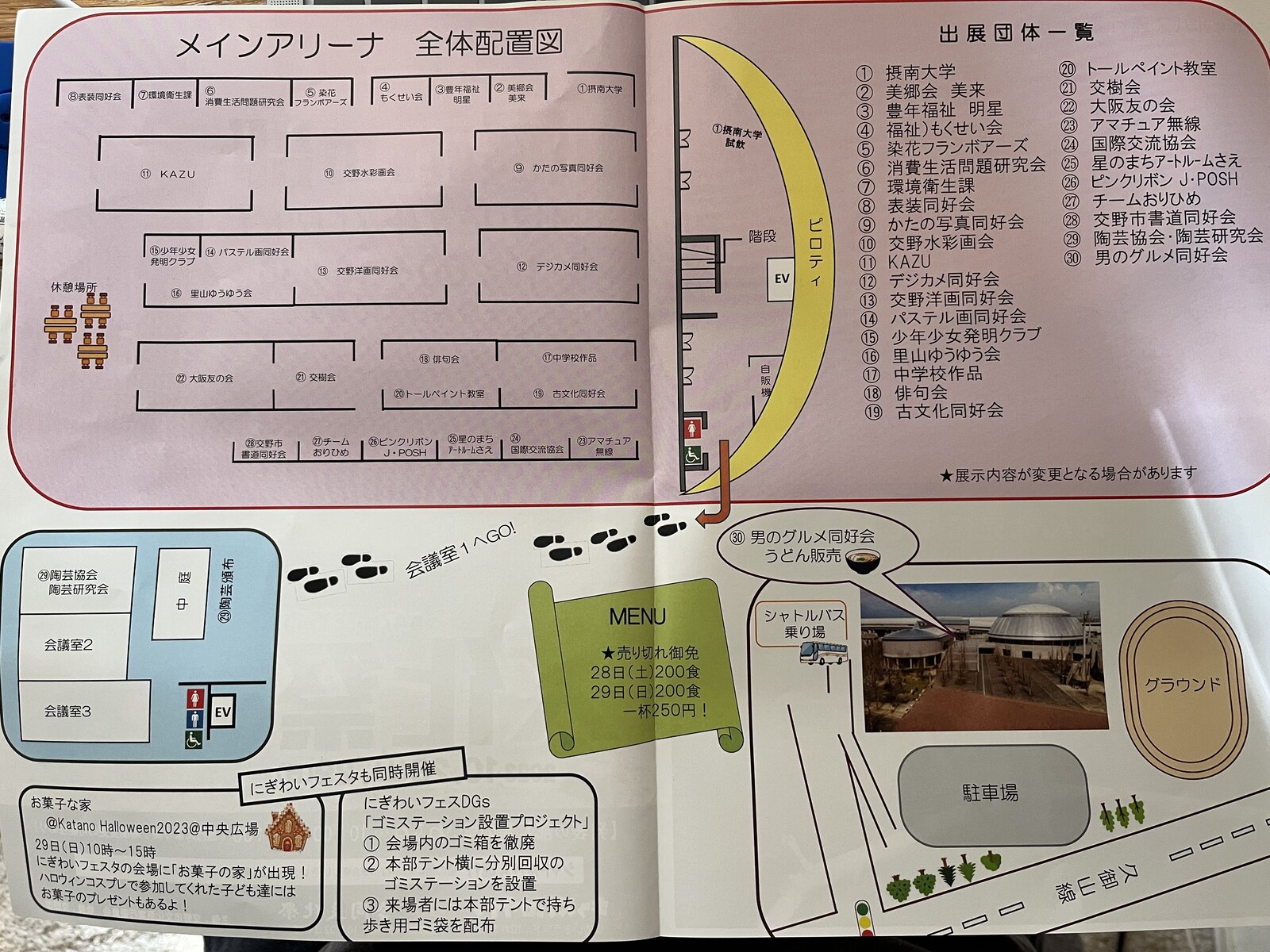 摂南大学薬学部、デジカメ同好会、(福祉)もくせい会、 交野少年少女発明クラブ、男のグルメ同好会、交野陶芸研究会、交野陶芸協会、交野俳句会、交野古文化同好会、染花フランボワーズ、かたの写真同好会、トールペイント教室、交野水彩画会、交野市消費生活問題研究会、交野陶芸協会、表装同好会、KAZU、美郷会 美来、豊年福祉 明星、交野洋画同好会・パステル画同好会、交樹会、交野市書道同好会、交野アマチュア無線クラブ、交野市国際交流協会、市内小学校・中学校作品、星のまちアートルームさえ、環境衛生課、里山ゆうゆう会、大阪友の会、ピンクリボンJ・POSH、チームおりひめ
