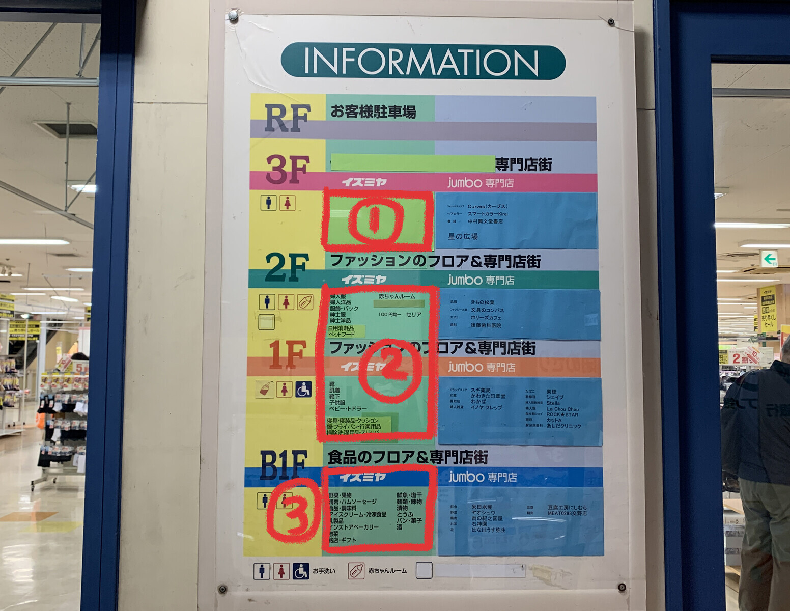 1階2階の②のイズミヤ直営1階、2階 衣料品・住居関連品売場が、2022年2月をもって閉場。