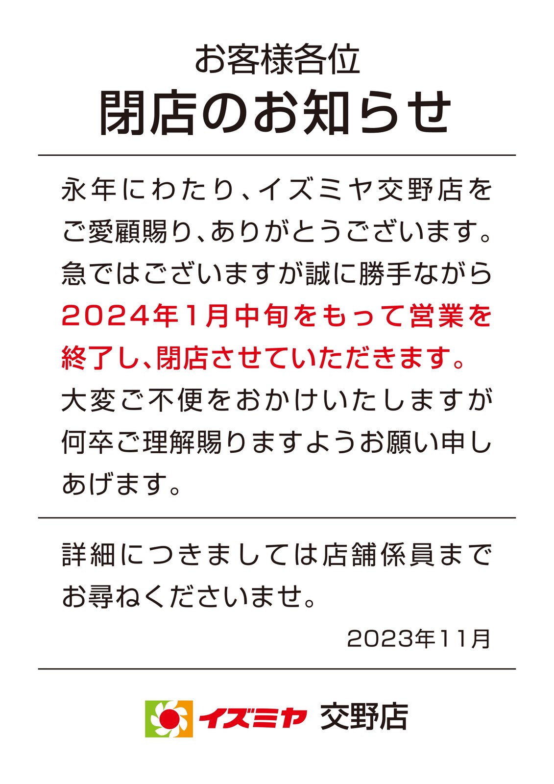 イズミヤ交野店が2024年1月中旬で営業終了。閉店の発表が!