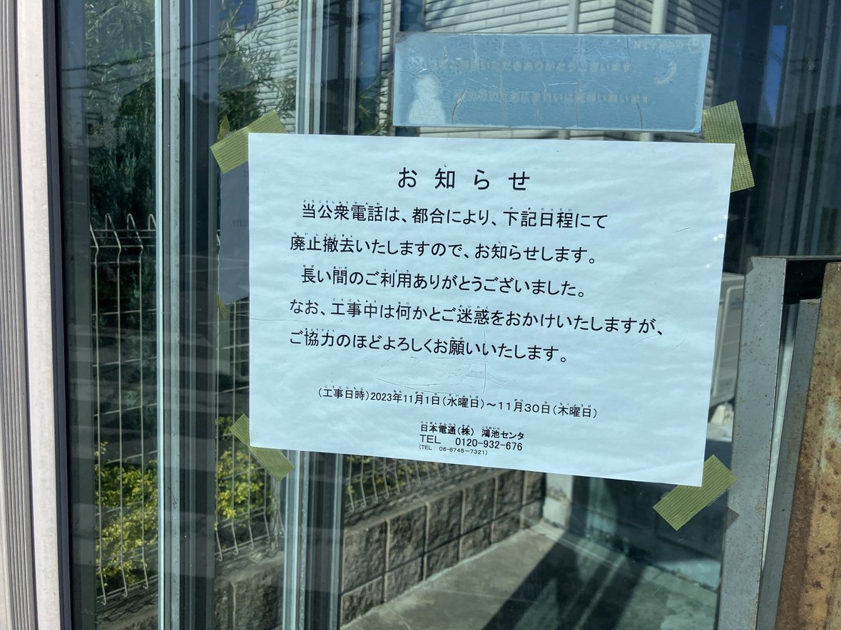 当公衆電話は、都合により、下記日程にて廃止撤去しますので、お知らせします。